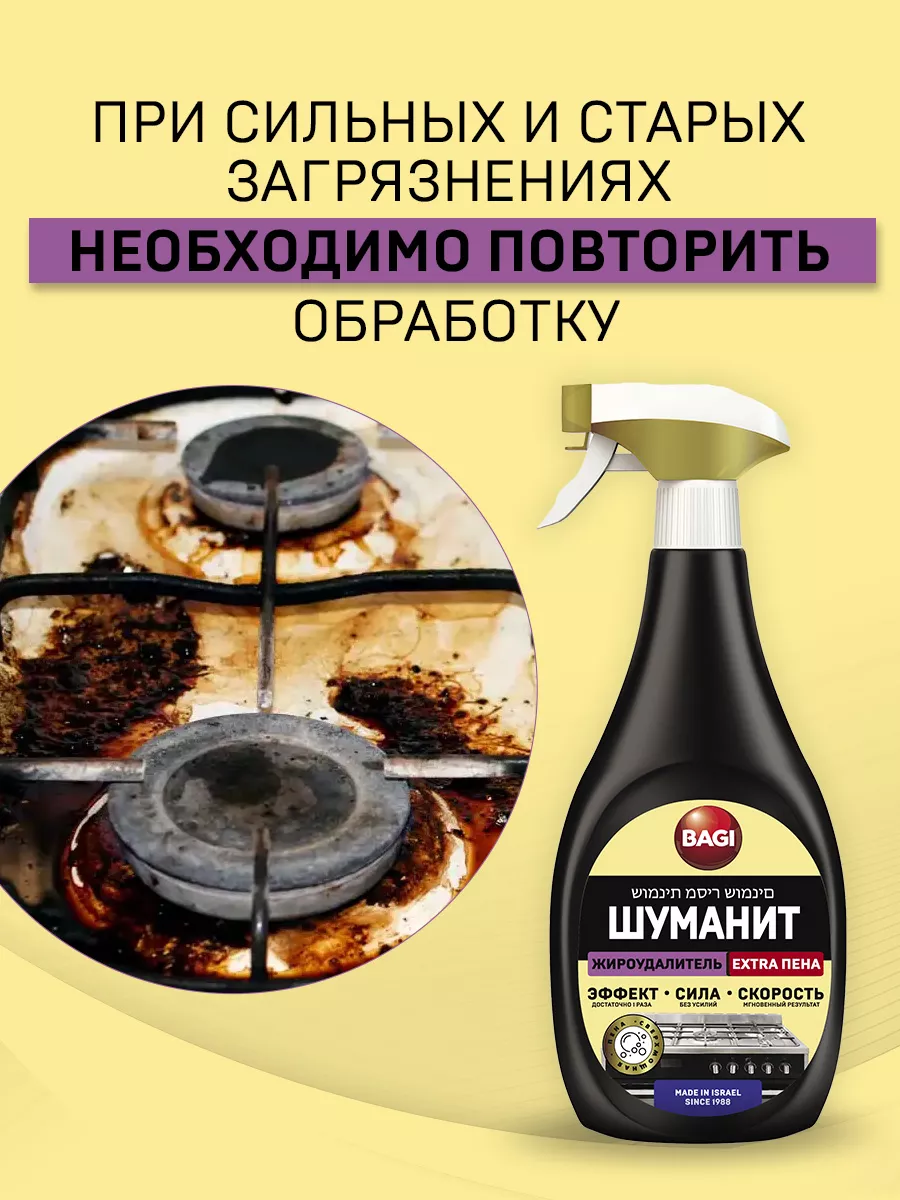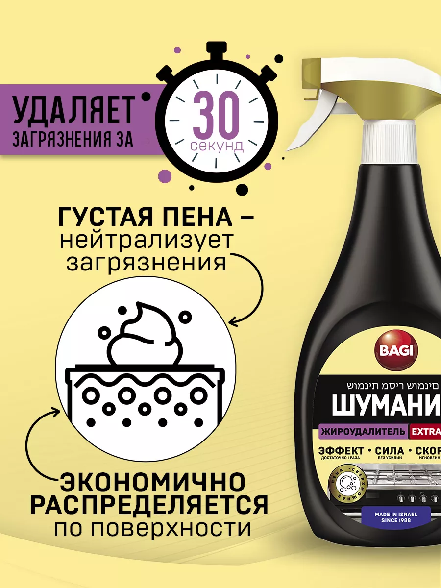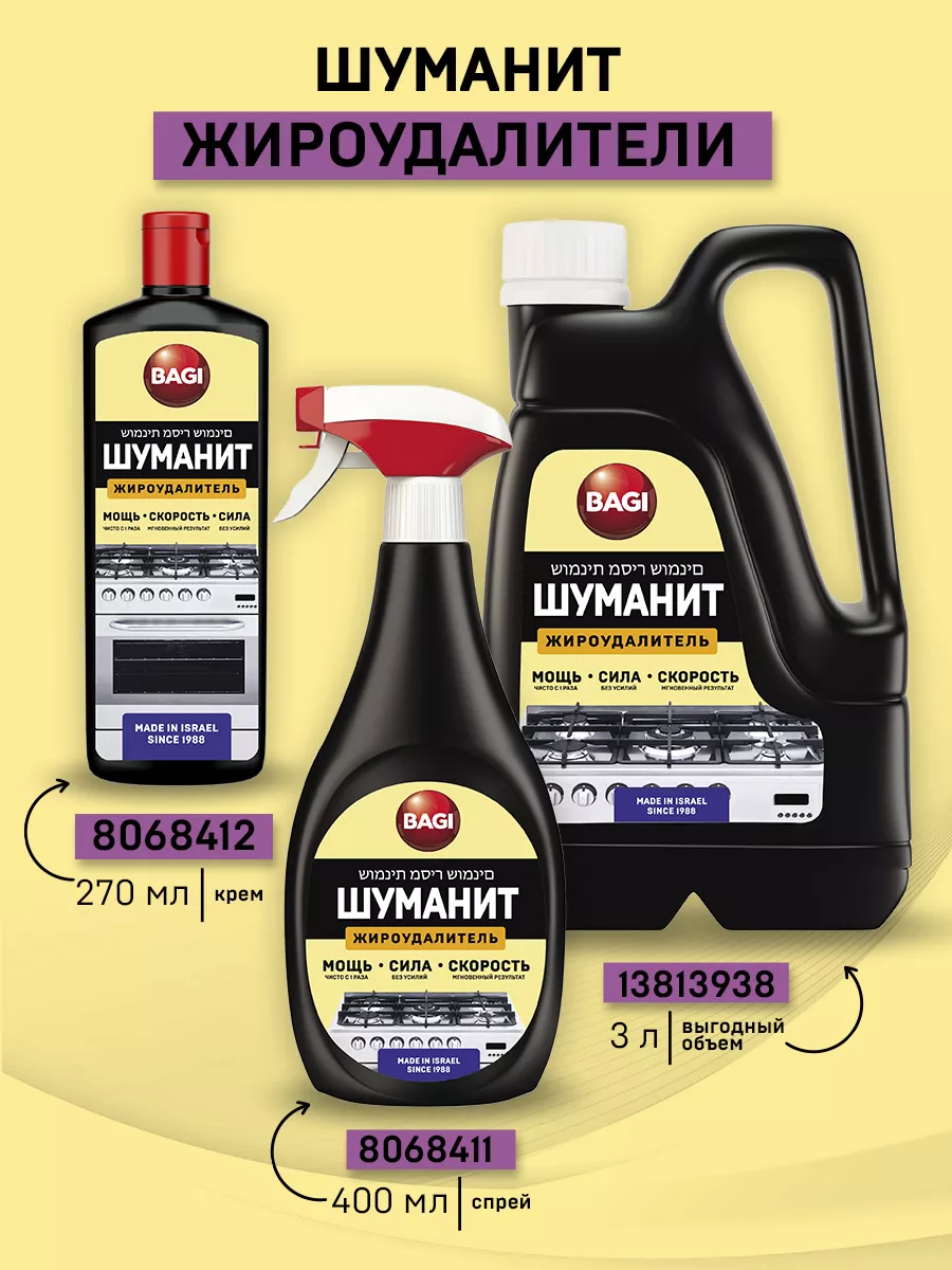 Описание: Бытовая химия Bagi - спрей Шуманит жироудалитель - средство для мгновенного удаления жира, въевшихся, стойких и пригоревших загрязнений с плит; духовых шкафов; вытяжек; пароуловителей; грилей; кастрюль; сковородок и других поверхностей. Всего за 30 секунд активные чистящие компоненты средства расщепляют и превращают в легко смываемую жидкость даже твердый застывший жир и нагар. Средство для чистки духовки благодаря пенной консистенции отлично держится на решетках и вертикальный поверхности, благодаря чему эффективнее очищает их. СПОСОБ ПРИМЕНЕНИЯ: Равномерно распылить чистящее средство Шуманит спрей жироудалитель для кухни (анти жир) на загрязненную поверхность, оставить от 30 секунд до 1 минуты. Протереть влажной тряпкой и смыть моющее средство водой. При необходимости повторить обработку. ИДЕАЛЬНО ПОДХОДИТ для удаления жира, нагара, копоти, грязи с: плиты; вытяжки; гриля; противня; решеток для барбекю; шампуров; грасс; азелит и пр. Меры предосторожности: Рекомендуется использовать резиновые перчатки. Средство для плиты антижир не использовать для чистки изделий из алюминия, окрашенных поверхностей и тефлоновых покрытий. Обращаем внимание, что товары для уборки нашего магазина являются 100% оригинальной, так как ООО Си Джи Импорт и Логистика является официальным импортером Bagi в Россию и Белоруссию.