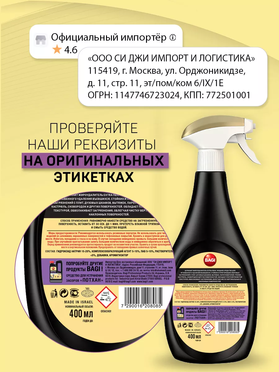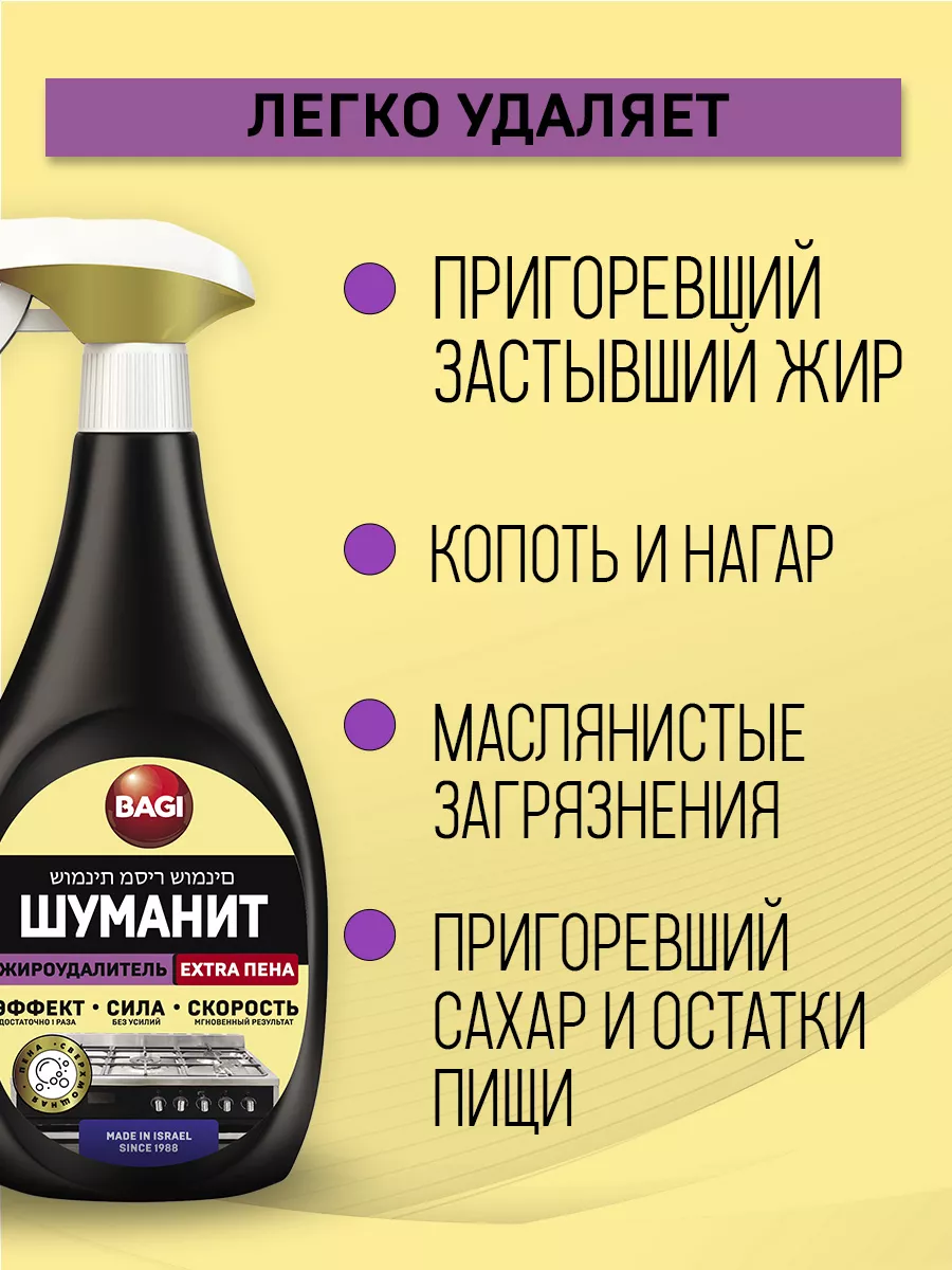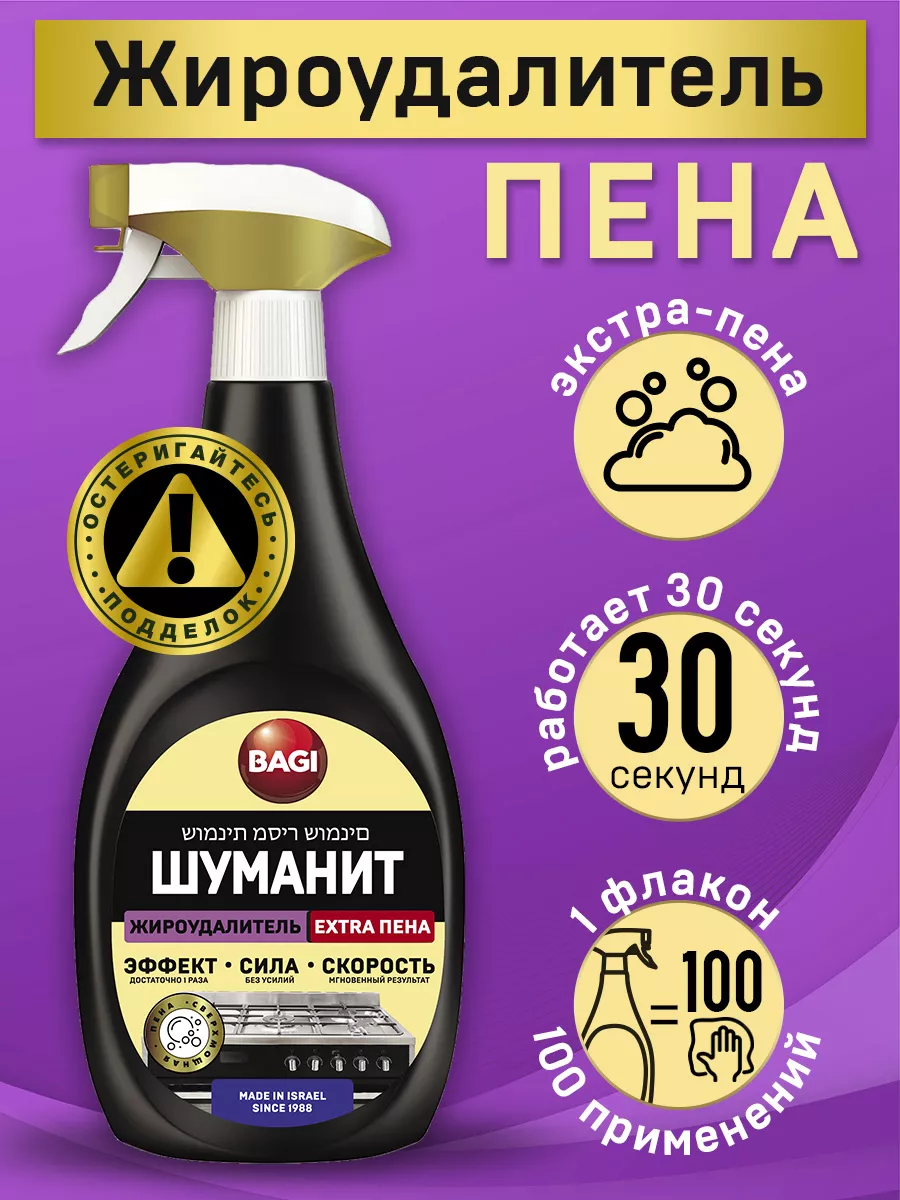 Описание: Бытовая химия Bagi - спрей Шуманит жироудалитель - средство для мгновенного удаления жира, въевшихся, стойких и пригоревших загрязнений с плит; духовых шкафов; вытяжек; пароуловителей; грилей; кастрюль; сковородок и других поверхностей. Всего за 30 секунд активные чистящие компоненты средства расщепляют и превращают в легко смываемую жидкость даже твердый застывший жир и нагар. Средство для чистки духовки благодаря пенной консистенции отлично держится на решетках и вертикальный поверхности, благодаря чему эффективнее очищает их. СПОСОБ ПРИМЕНЕНИЯ: Равномерно распылить чистящее средство Шуманит спрей жироудалитель для кухни (анти жир) на загрязненную поверхность, оставить от 30 секунд до 1 минуты. Протереть влажной тряпкой и смыть моющее средство водой. При необходимости повторить обработку. ИДЕАЛЬНО ПОДХОДИТ для удаления жира, нагара, копоти, грязи с: плиты; вытяжки; гриля; противня; решеток для барбекю; шампуров; грасс; азелит и пр. Меры предосторожности: Рекомендуется использовать резиновые перчатки. Средство для плиты антижир не использовать для чистки изделий из алюминия, окрашенных поверхностей и тефлоновых покрытий. Обращаем внимание, что товары для уборки нашего магазина являются 100% оригинальной, так как ООО Си Джи Импорт и Логистика является официальным импортером Bagi в Россию и Белоруссию.