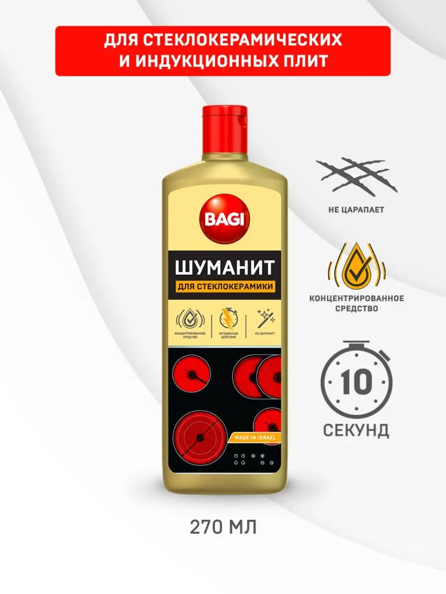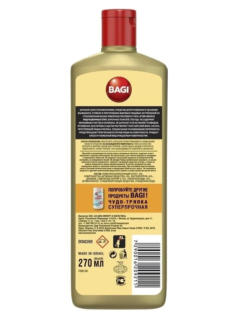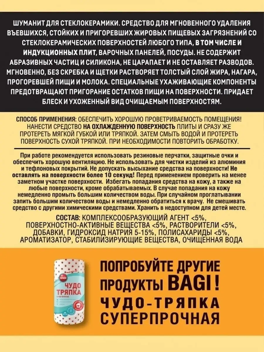 Описание: Бытовая химия (чистящие средства) Bagi - Шуманит жироудалитель для стеклокерамики. Антижир для удаления жира для плит, 270 мл. Концентрированное средство для стеклокерамческих, индукционных плит и варочных панелей за 10 секунд растворяет толстый слой жира; нагара; пригоревшей пищи; молока и сахара. Средство подходит для удаления въевшихся, стойких и пригоревших жировых пищевых загрязнений со стеклокерамических поверхностей любого типа, варочных панелей, посуды. Густой слой концентрированной пены проникает в структуру "коричневых кругов" вокруг нагревательного элемента конфорки и разрушает их изнутри. Придает стеклокерамике блеск БЕЗ эффекта "радужных" разводов. Содержит активные чистящие вещества, которые помогают максимально эффективно справиться с застарелыми загрязнениями. Способ применения: Нанести средство, равномерно распределить губкой или тряпкой. Оставить не более чем на 10 секунд, смыть средство водой. При необходимости повторить уборку. Соблюдайте меры предосторожности и не давайте средству высыхать на поверхности Остерегайтесь подделок! Выбирая проверенного поставщика, вы приобретаете 100% оригинальный товар. ООО Си Джи Импорт и Логистика является официальным импортером Bagi в Россию и Белоруссию. Все товары магазина оригинальны.