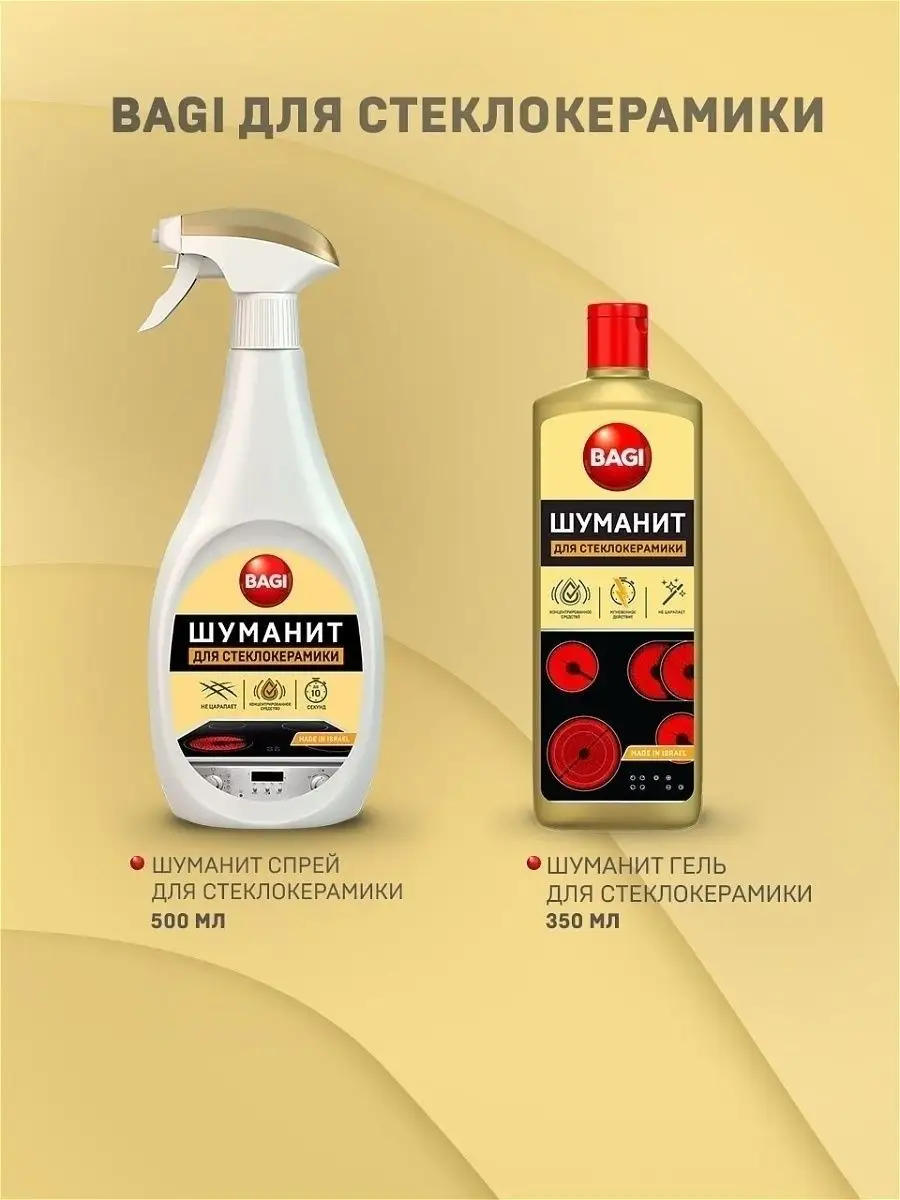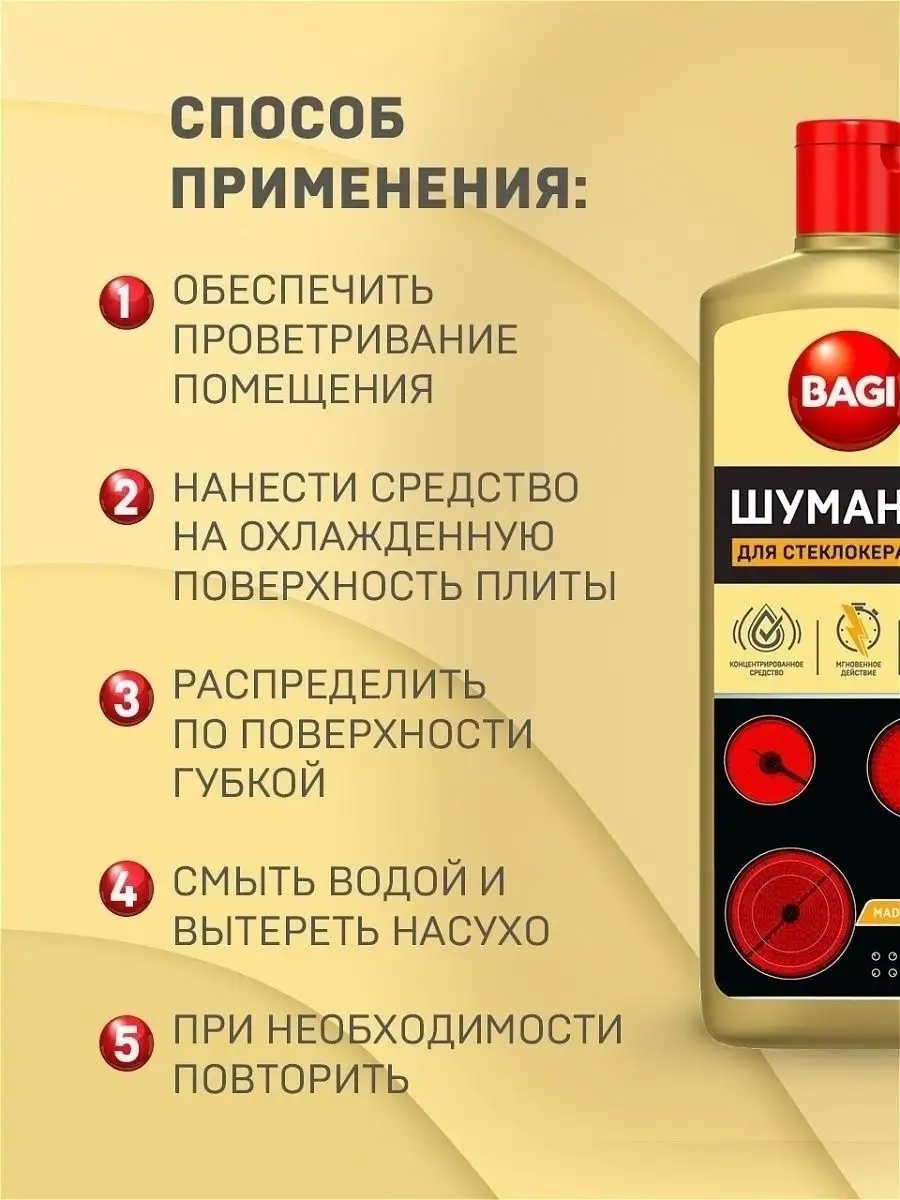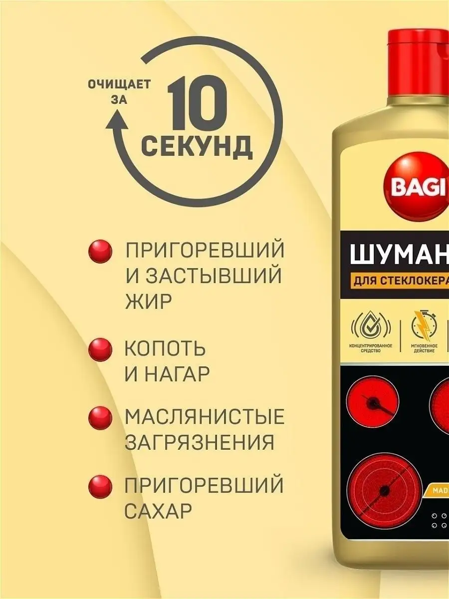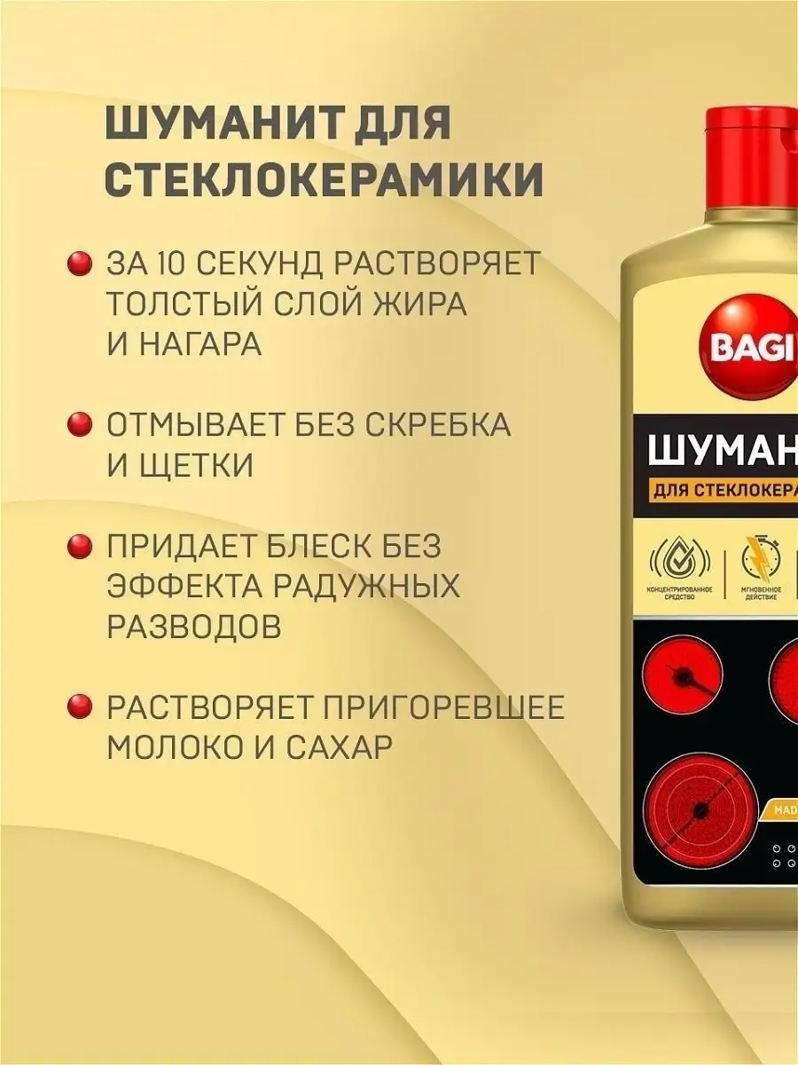 Описание: Бытовая химия (чистящие средства) Bagi - Шуманит жироудалитель для стеклокерамики. Антижир для удаления жира для плит, 270 мл. Концентрированное средство для стеклокерамческих, индукционных плит и варочных панелей за 10 секунд растворяет толстый слой жира; нагара; пригоревшей пищи; молока и сахара. Средство подходит для удаления въевшихся, стойких и пригоревших жировых пищевых загрязнений со стеклокерамических поверхностей любого типа, варочных панелей, посуды. Густой слой концентрированной пены проникает в структуру "коричневых кругов" вокруг нагревательного элемента конфорки и разрушает их изнутри. Придает стеклокерамике блеск БЕЗ эффекта "радужных" разводов. Содержит активные чистящие вещества, которые помогают максимально эффективно справиться с застарелыми загрязнениями. Способ применения: Нанести средство, равномерно распределить губкой или тряпкой. Оставить не более чем на 10 секунд, смыть средство водой. При необходимости повторить уборку. Соблюдайте меры предосторожности и не давайте средству высыхать на поверхности Остерегайтесь подделок! Выбирая проверенного поставщика, вы приобретаете 100% оригинальный товар. ООО Си Джи Импорт и Логистика является официальным импортером Bagi в Россию и Белоруссию. Все товары магазина оригинальны.