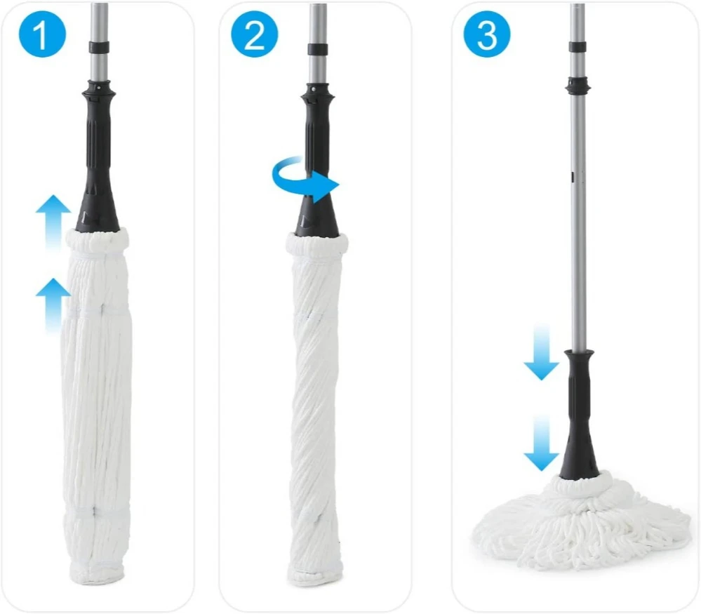 2. ФУНКЦИИ: швабра Twist из микрофибры плотно улавливает пыль, волосы и грязь, что делает уборку пола легкой и простой; Чистящая Подушка на насадке швабры помогает удалить стойкие пятна на полу.