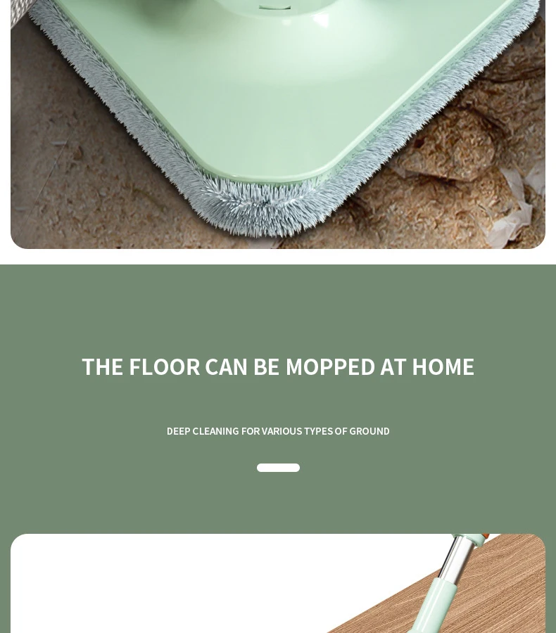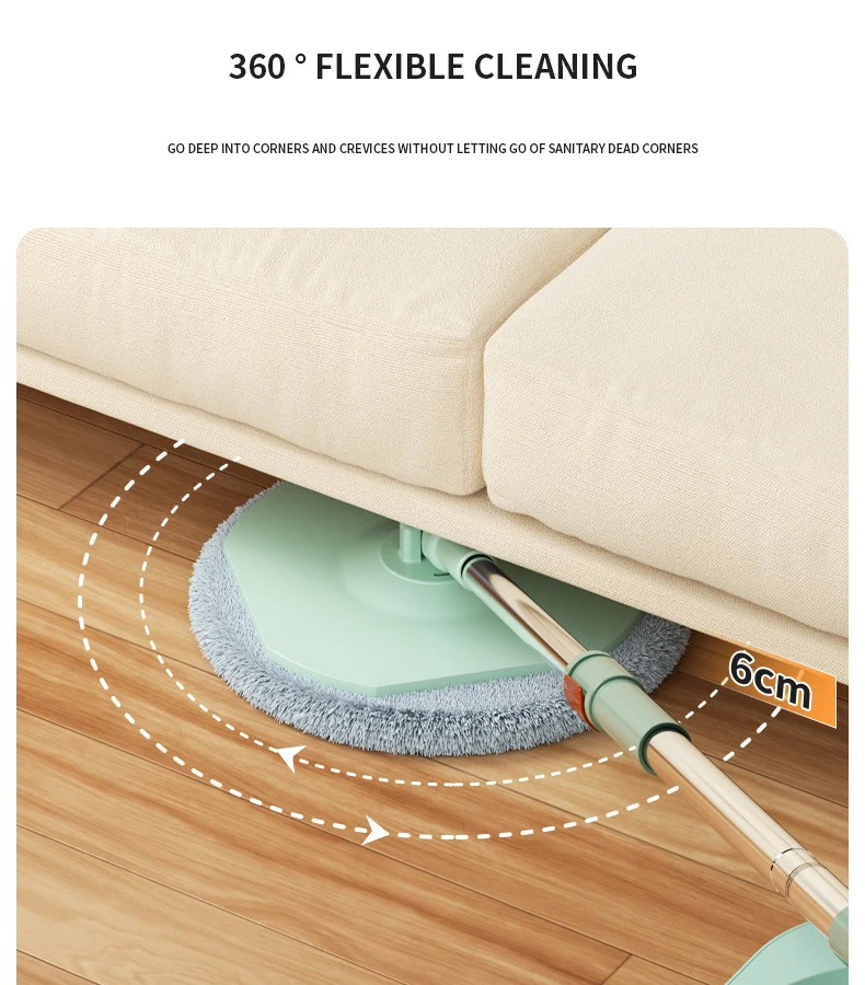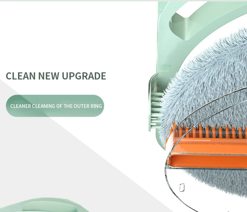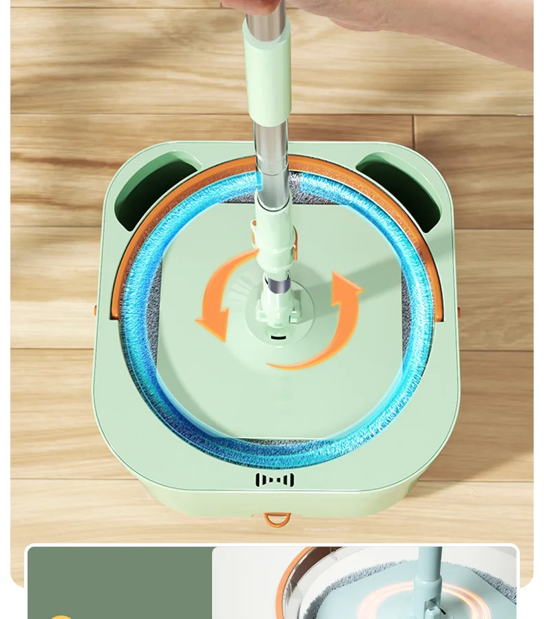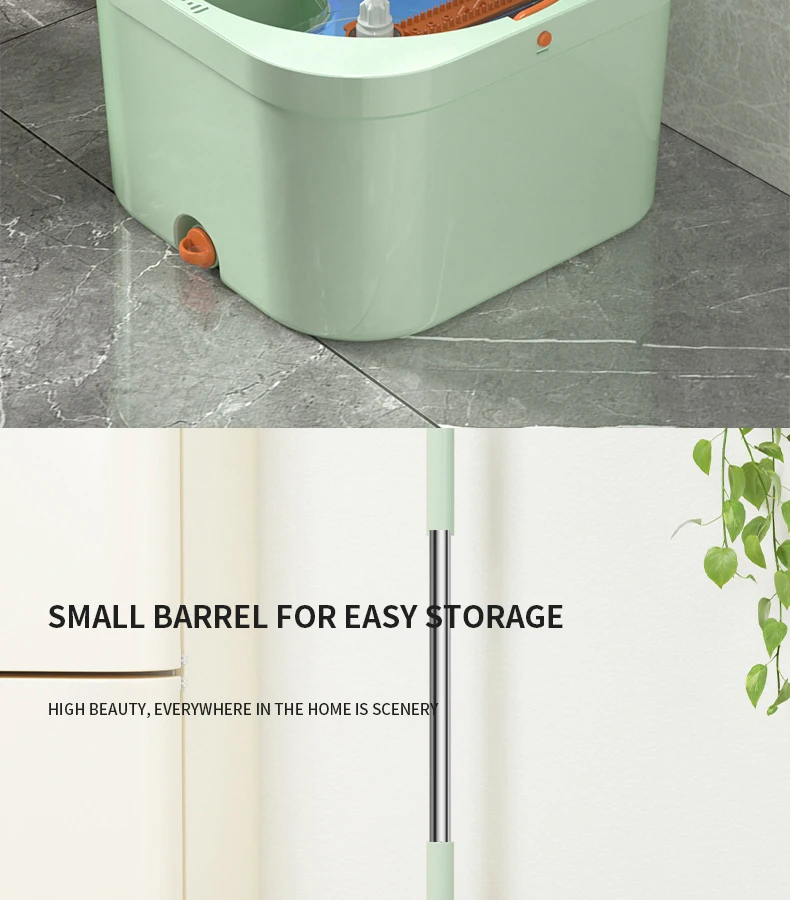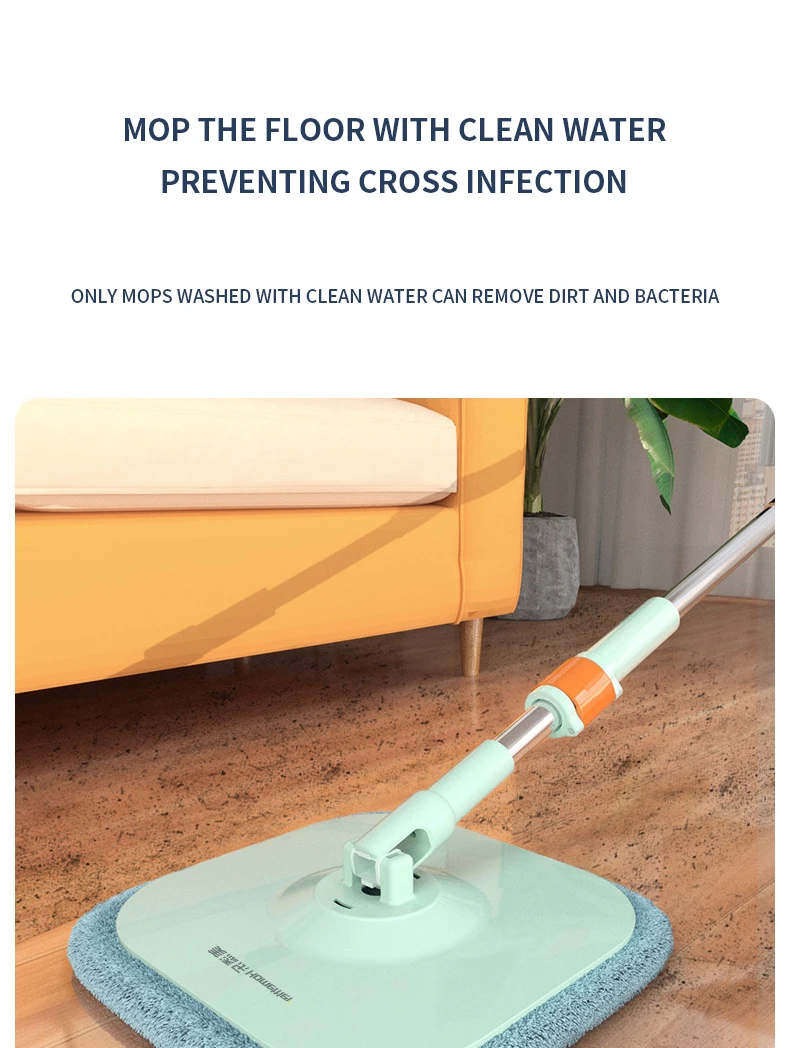 Нажмите и поверните, чтобы очистить, конструкция распылителя чистой воды, используйте только чистую воду для очистки швабры. Грязная вода сбрасывается в канализационную зону. Чистая и грязная конструкция разделения помогает сэкономить больше воды и избежать вторичного загрязнения швабры и больше не использовать сточные воды для многократной очистки швабры.