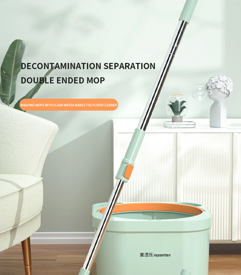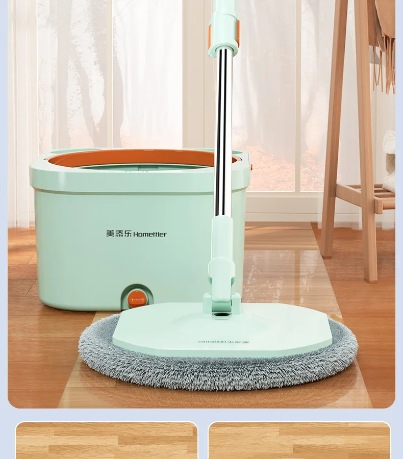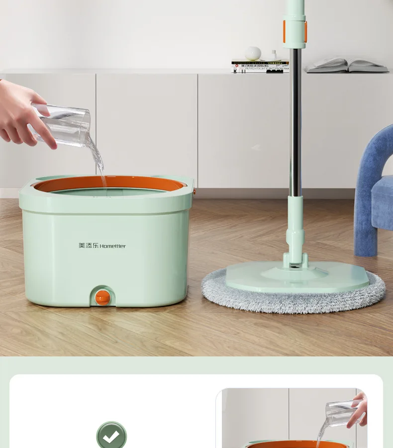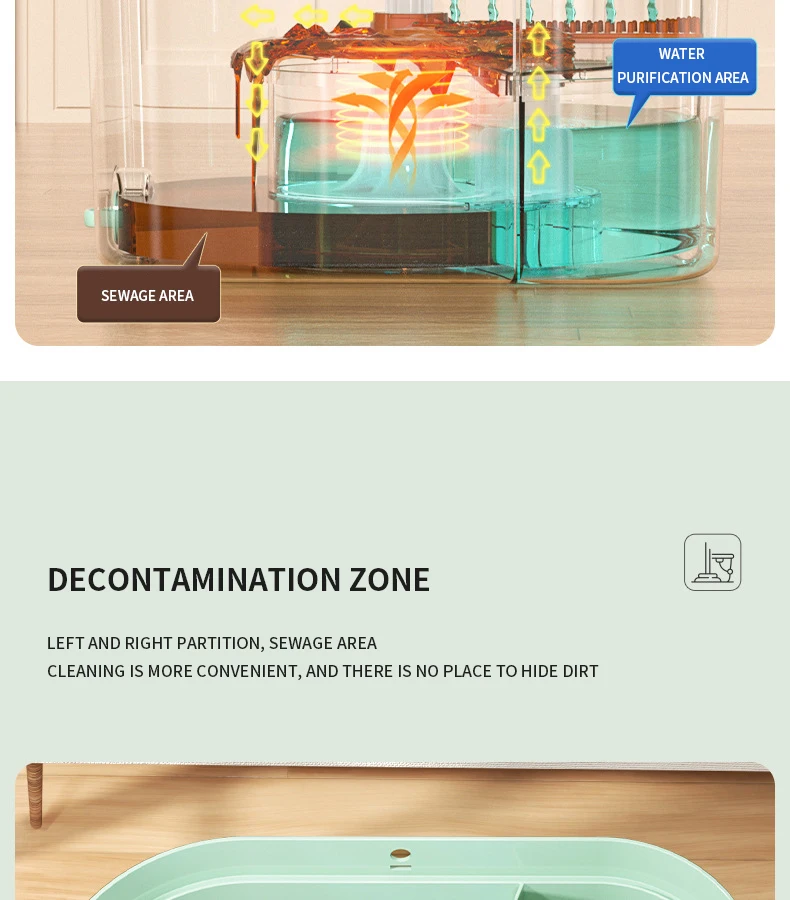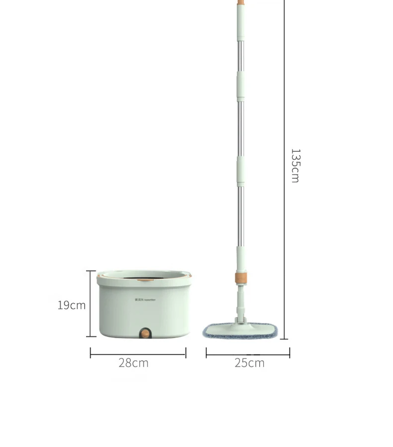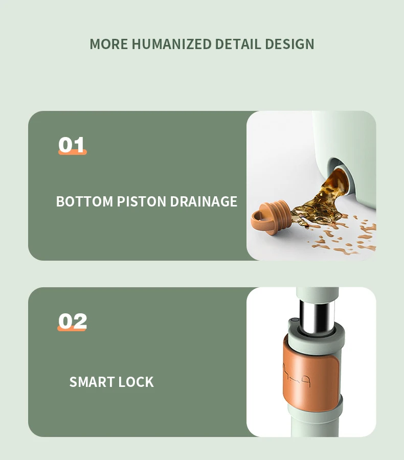 Нажмите и поверните, чтобы очистить, конструкция распылителя чистой воды, используйте только чистую воду для очистки швабры. Грязная вода сбрасывается в канализационную зону. Чистая и грязная конструкция разделения помогает сэкономить больше воды и избежать вторичного загрязнения швабры и больше не использовать сточные воды для многократной очистки швабры.