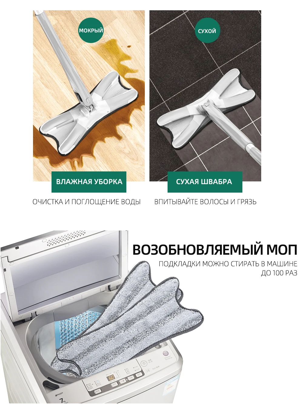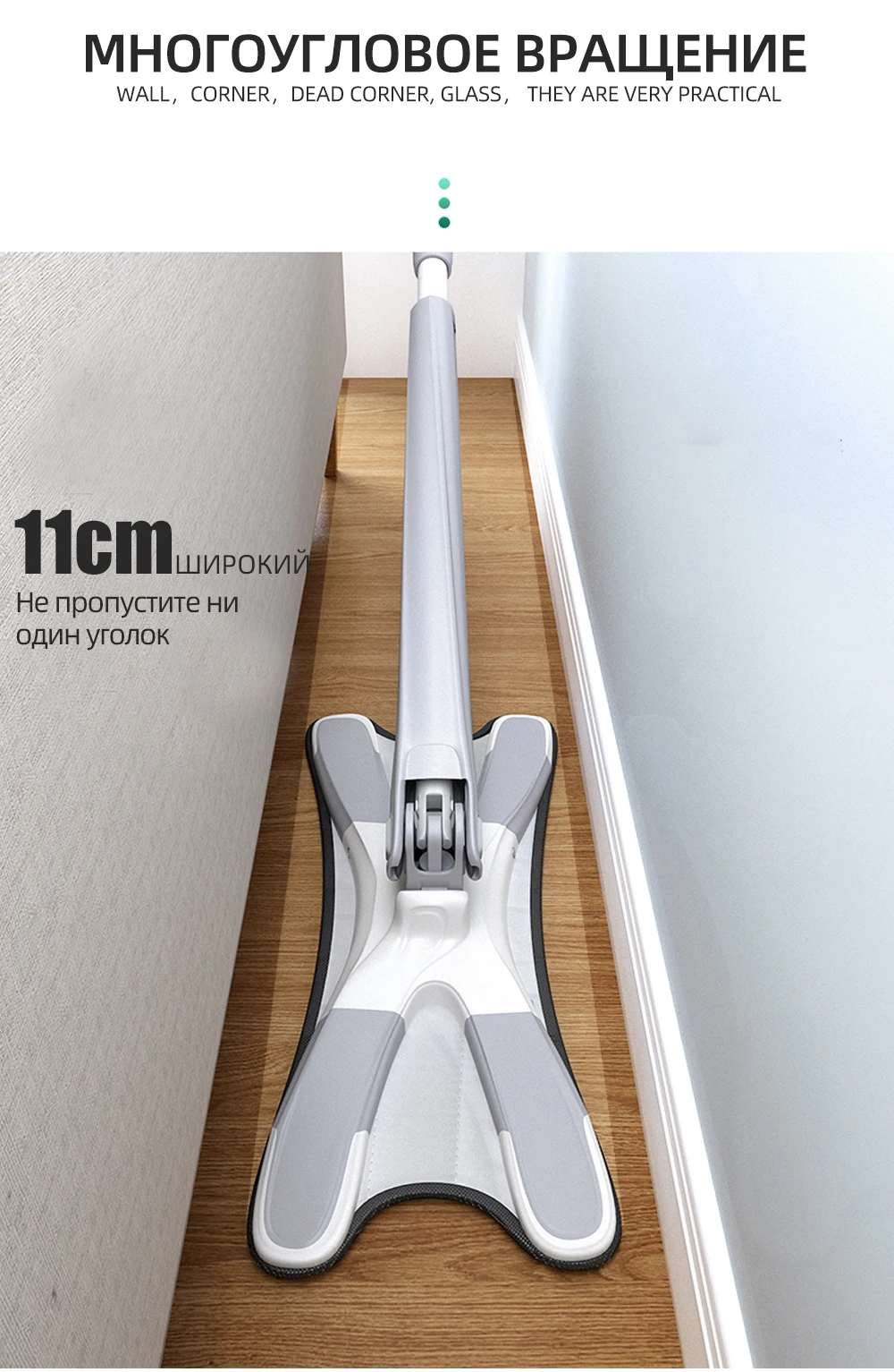 Вращающаяся на 360 ° насадка швабры: поворачивающаяся на 360 ° насадка вместе с X-образной конструкцией позволяет легко маневрировать в труднодоступных местах. Тонкая стальная ручка длиной 140 см обеспечивает простой доступ плоской швабры к узким пространствам, таким как щели или щели под кроватью или между диванами. С нашим очистителем для полов с твердым покрытием вы сможете эффективно убирать в доме. Больше не нужно наклоняться к швабре.