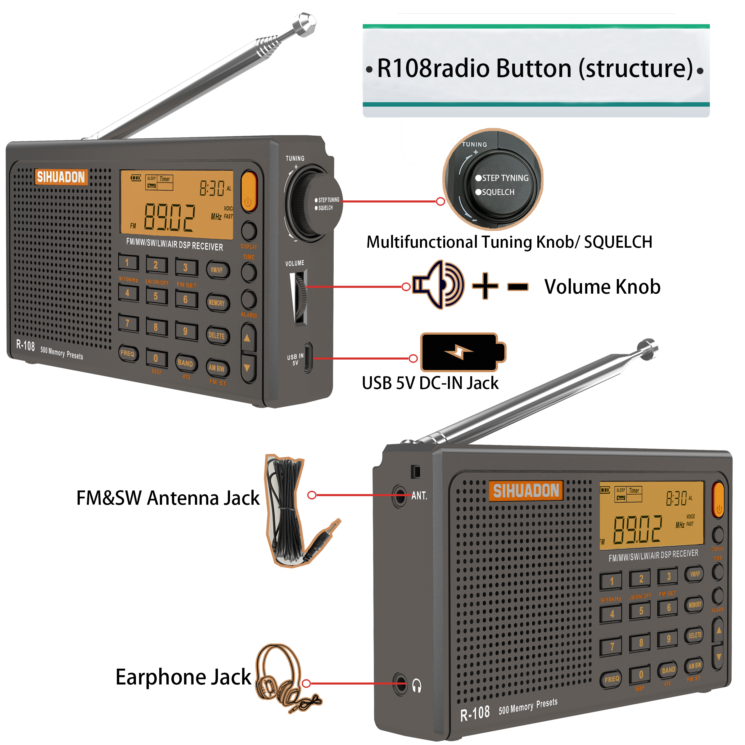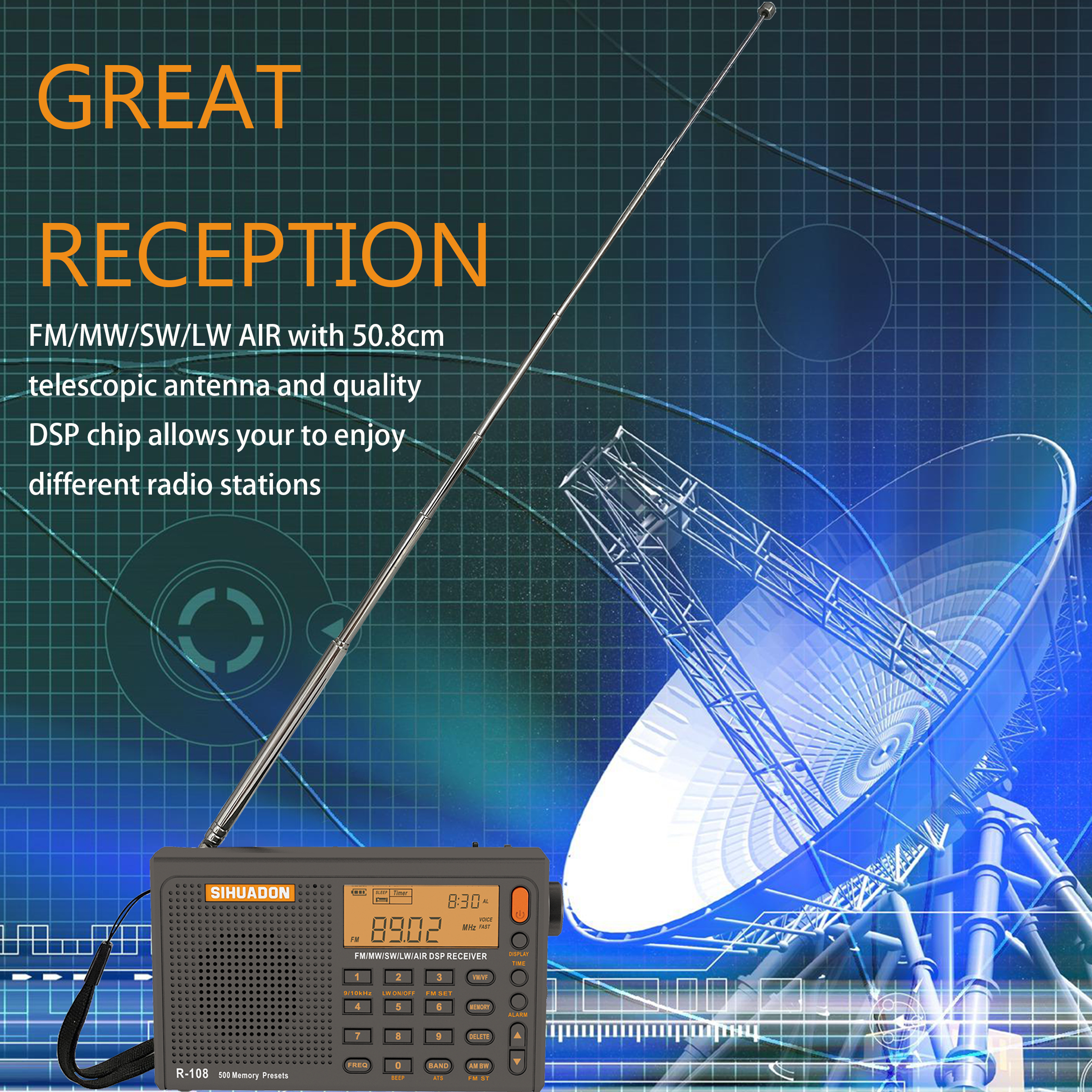 SIHUADON R-108 Радио FM стерео цифровое портативное радио AM SW воздушный радиоприемник функция будильника дисплей часы температура динамик