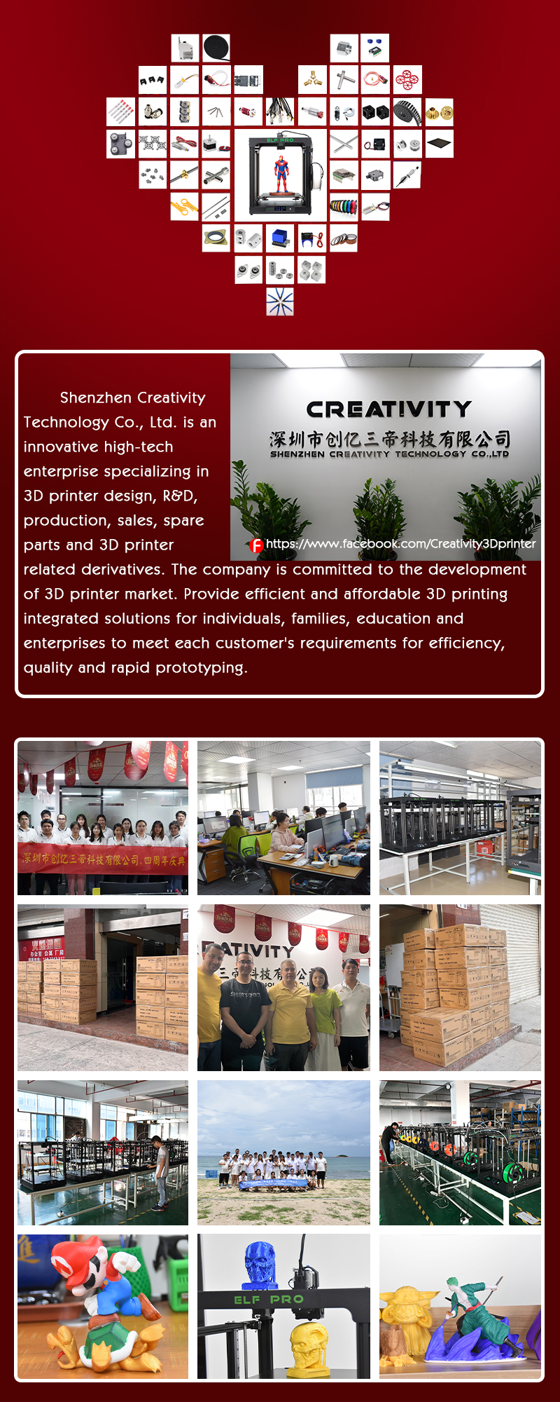 Creativity-это инновационное высокотехнологичное предприятие, специализирующееся на проектировании 3D-принтеров, исследованиях и разработках, производстве, продаже, запасных частях и производных 3D-принтеров. Компания стремится к развитию и инновациям рынка 3D-принтеров для отдельных лиц, семей, образования. Компания предоставляет эффективное и доступное решение для 3D-печати, чтобы удовлетворить требования каждого клиента к эффективности, качество и быстрое прототипирование.