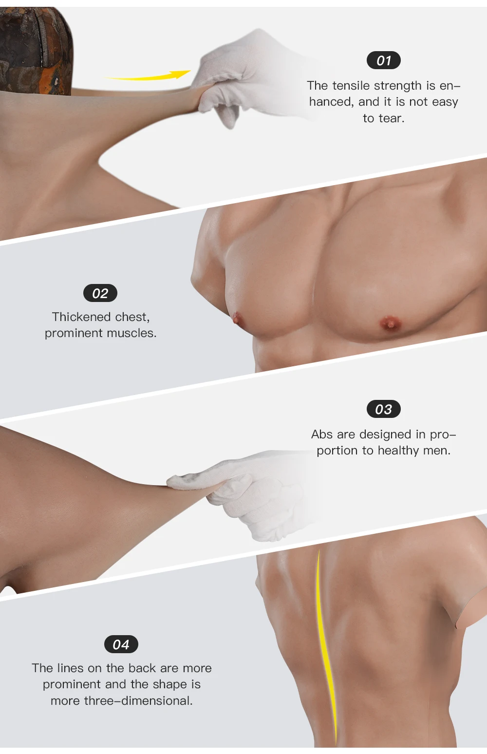 -Силиконовая искусственная грудная мышца: реалистичные кровеносные сосуды, могут улучшить мышцы груди, идеальную линию живота, ярко движется вместе с телом, обеспечивая идеальную посадку и комфорт.