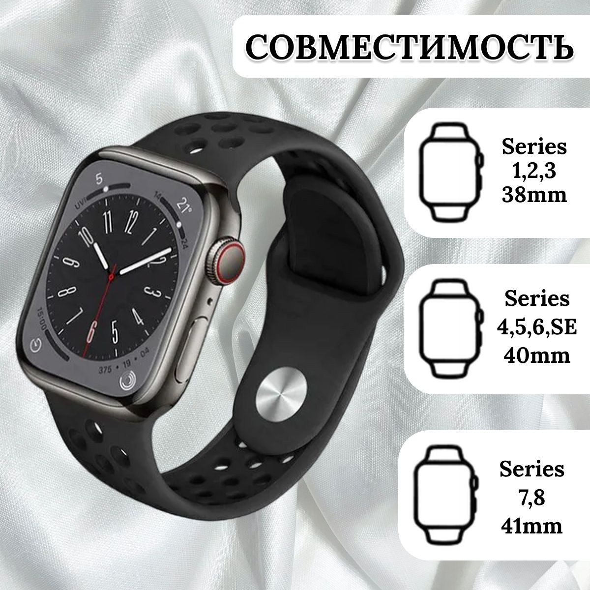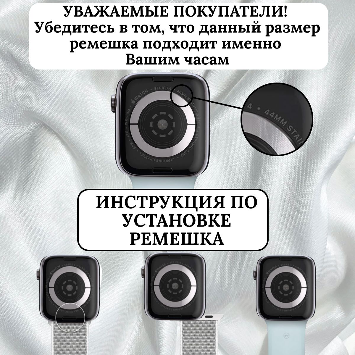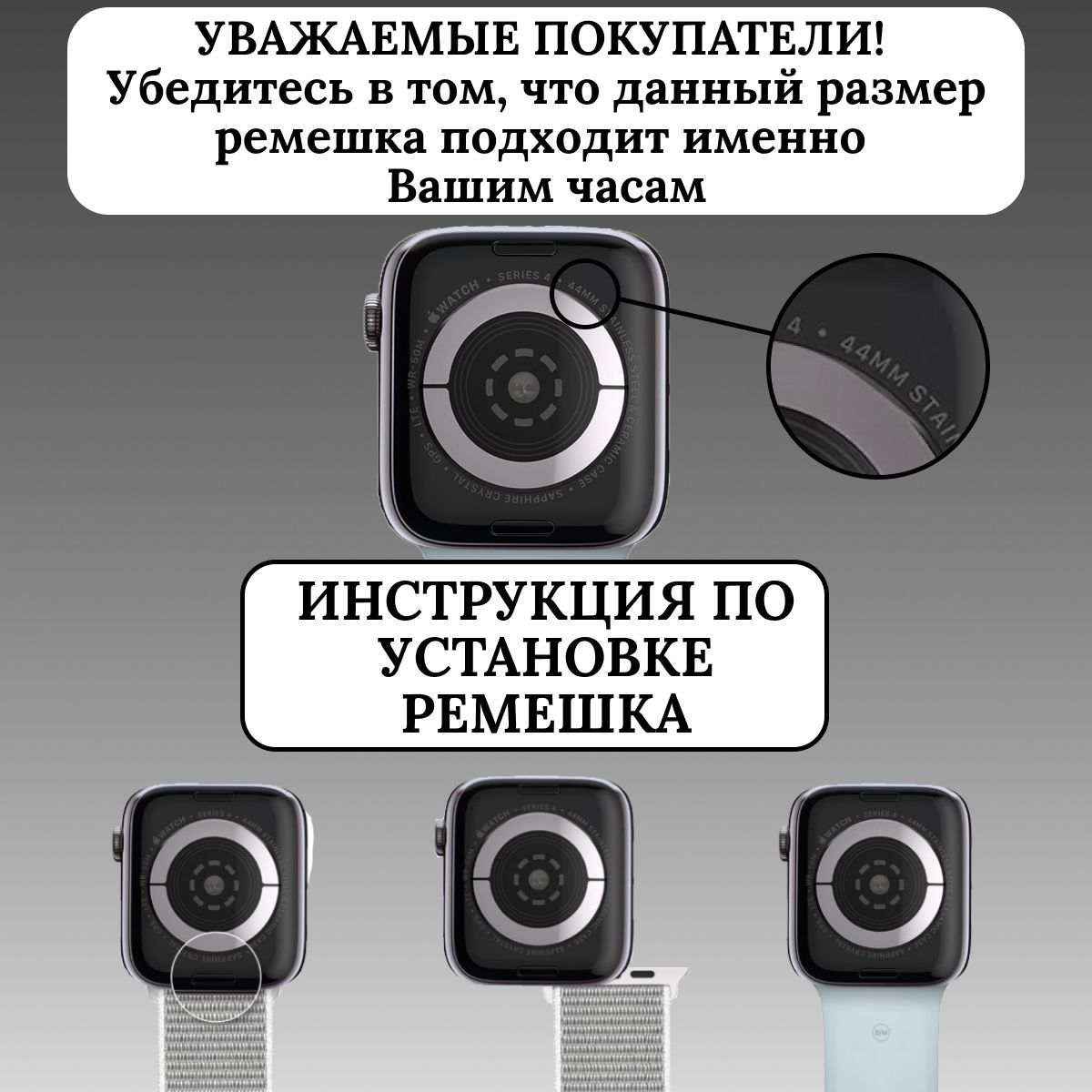 Таким образом, силиконовый спортивный ремешок на застежке pin-and-tuck для Apple Watch является идеальным выбором для тех, кто ценит комфорт, практичность и активный образ жизни. Он сочетает в себе надежность, удобство и стиль, делая ваш Apple Watch не только функциональным устройством, но и модным аксессуаром, который дополнит ваш образ в любой ситуации. ИнструкцияУважаемые покупатели! Перед покупкой, удостоверьтесь, что данный ремешок подойдет для Ваших Apple Watch. На изображении показано, где указывается Размер циферблата Ваших часов, а также как заменить ремешок. Данная карточка товара предназначена для Эпл Вотч размером 38, 40, 41 мм.