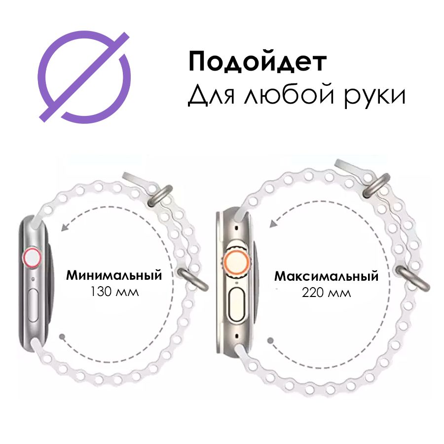 Описание: Ремешок Ocean для Apple WatchУникальный дизайн придаст вашим часам новый вид. Новое крепление, которе легко зацепляются и расстегиваются, но при этом крепко держат часы на вашей руке.Уникальное креплениеУдобная клипса, которая позволит отрегулировать ремешок на любой руке. А при необходимости вы сможете расстегнуть его без особых усилий.СовместимостьРемешок предназначен для Часов с циферблатом 42 мм, 44 мм, 45 мм и 49 мм.УниверсальныйРемешок подойдет под руку от 130 мм до 220 мм.Для влажных помещенийМы можете снять часы и стереть всю влагу с ремешка. Ремешок не впитывает влагу и не мозолит запястье.Обратите вниманиеВо время установки необходимо придавить центральную клипсу на ремешке. Это необходимо сделать для созранения Clip-механизма и крпкой установки на часах.Наш ассортиментПрозрачные чехлыЗащитные стеклаКабели для зарядкиГидрогелевые пленки