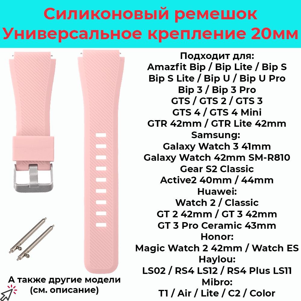 1.) Силиконовый ремешок для смарт-часов с шириной 20мм в месте крепления к часам 2.) Быстросъемные штифты для крепления к часам - 2 штуки 3.) Индивидуальная упаковка