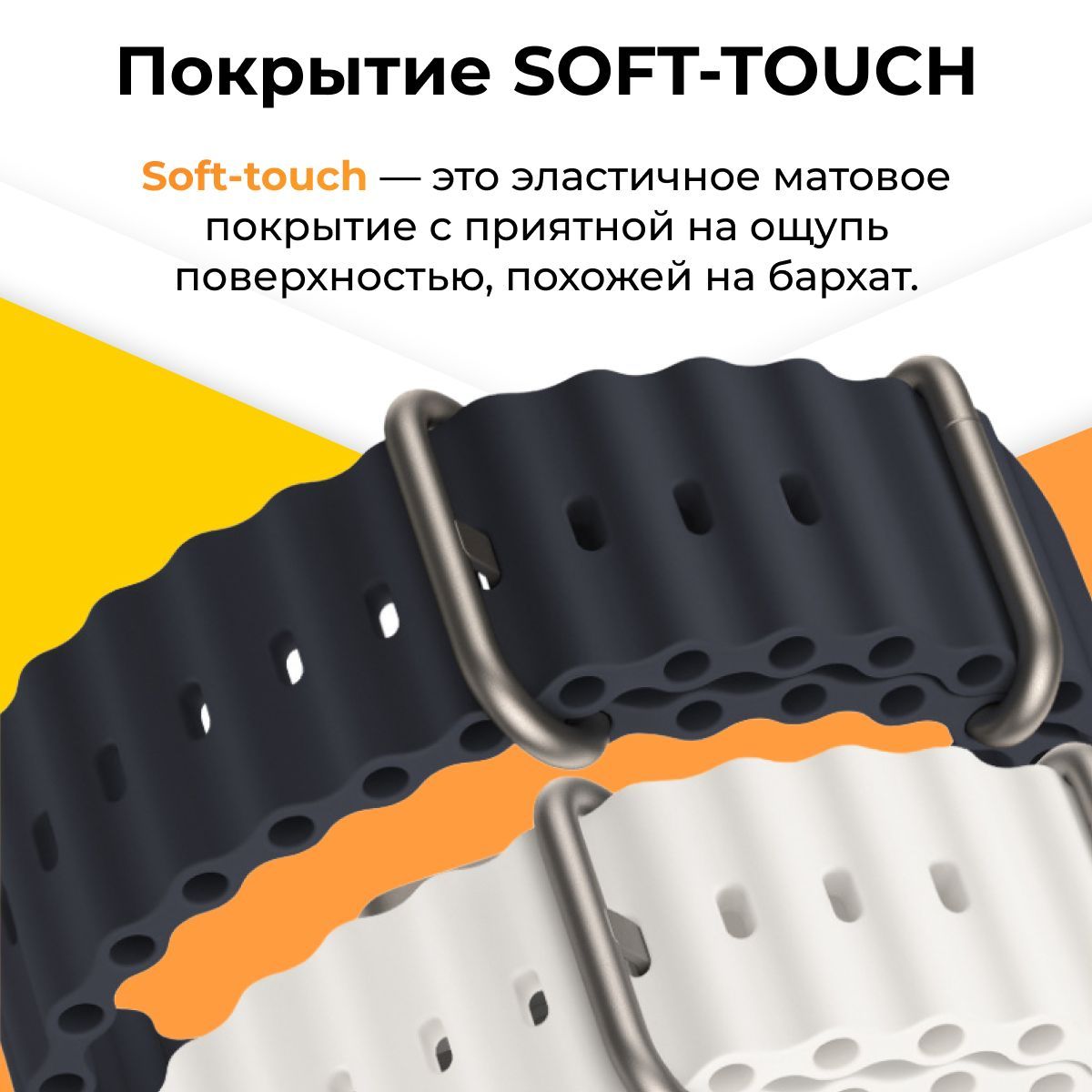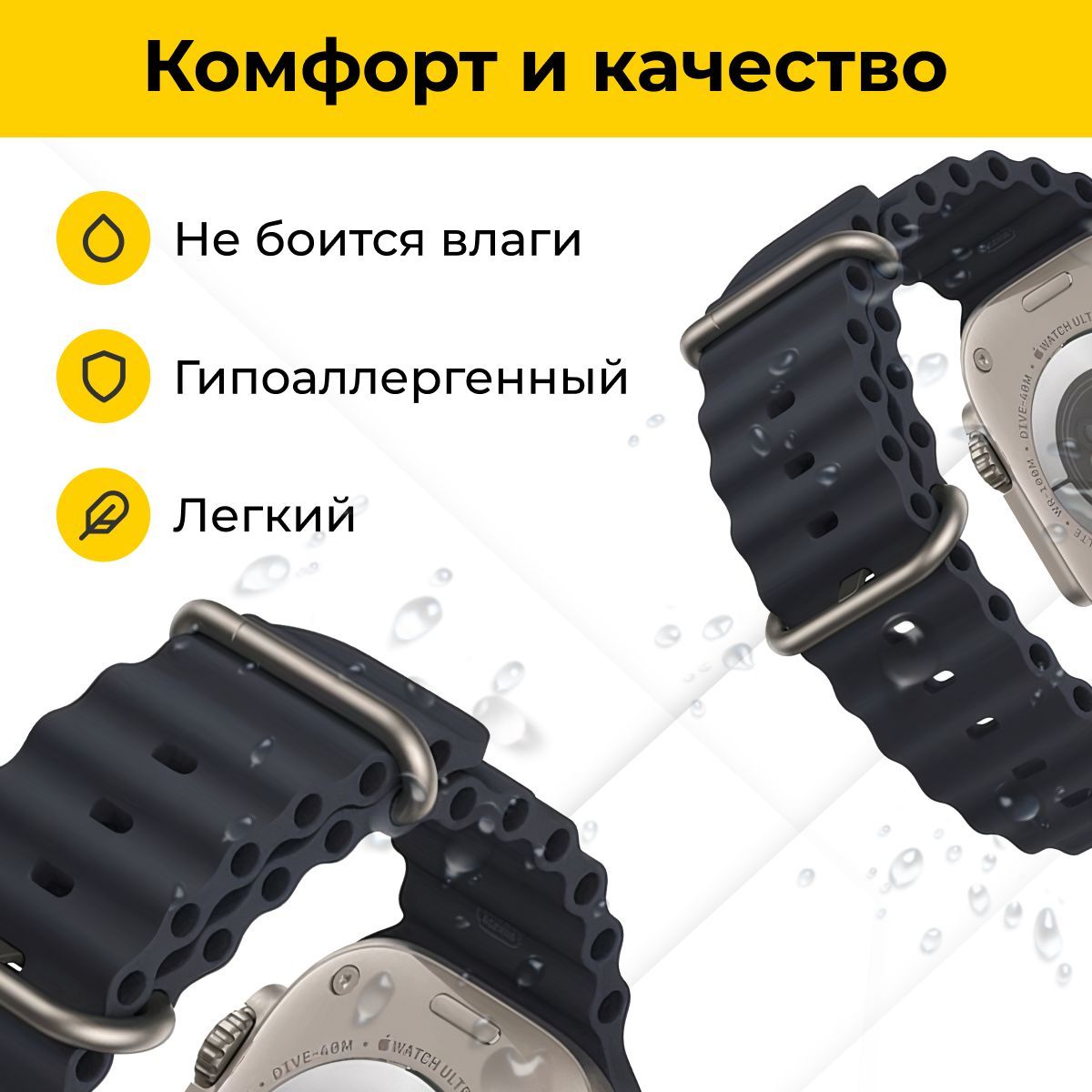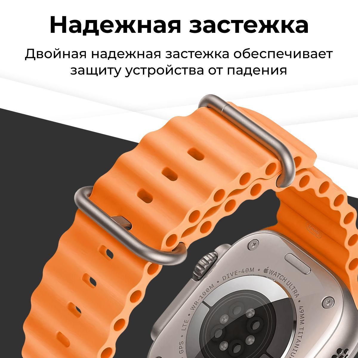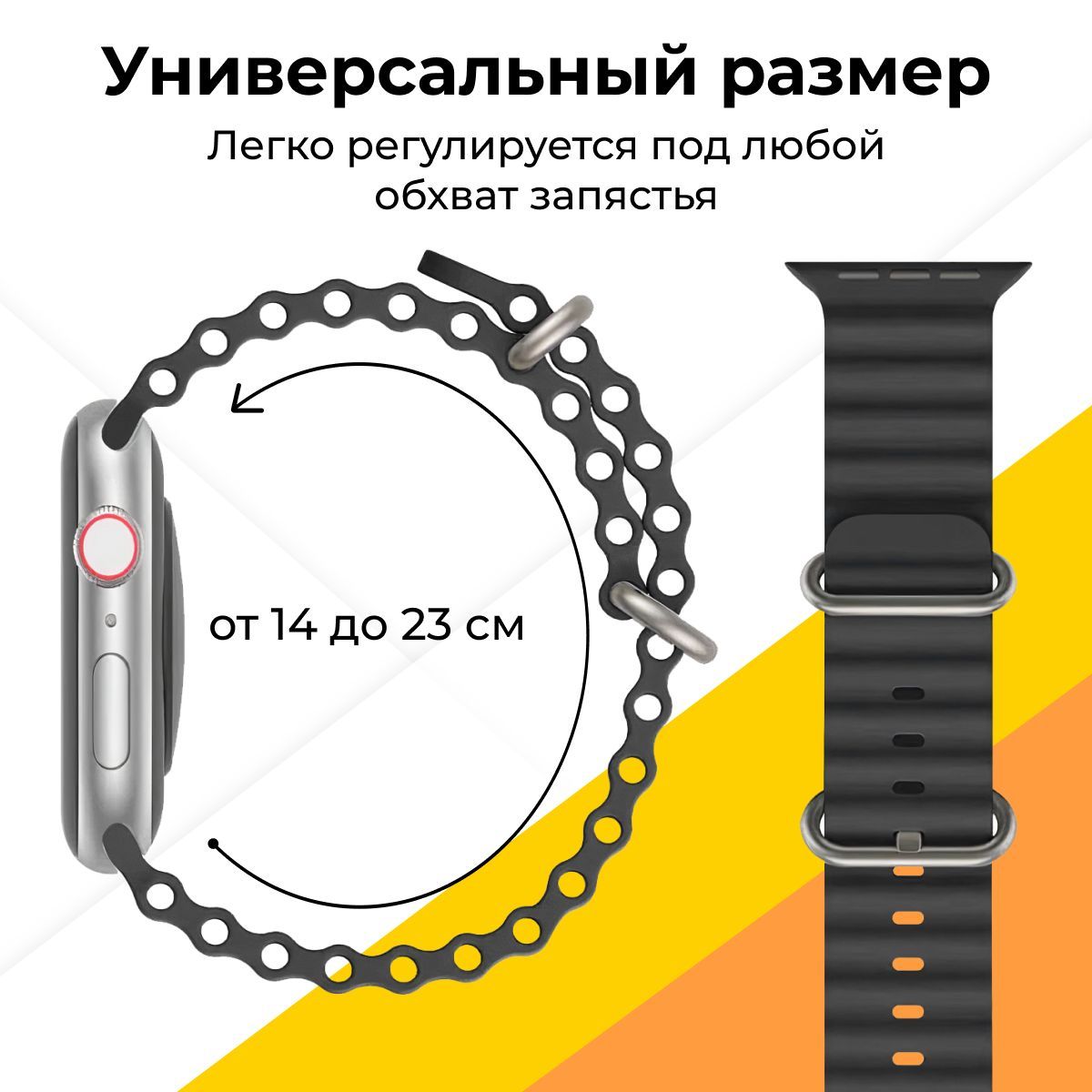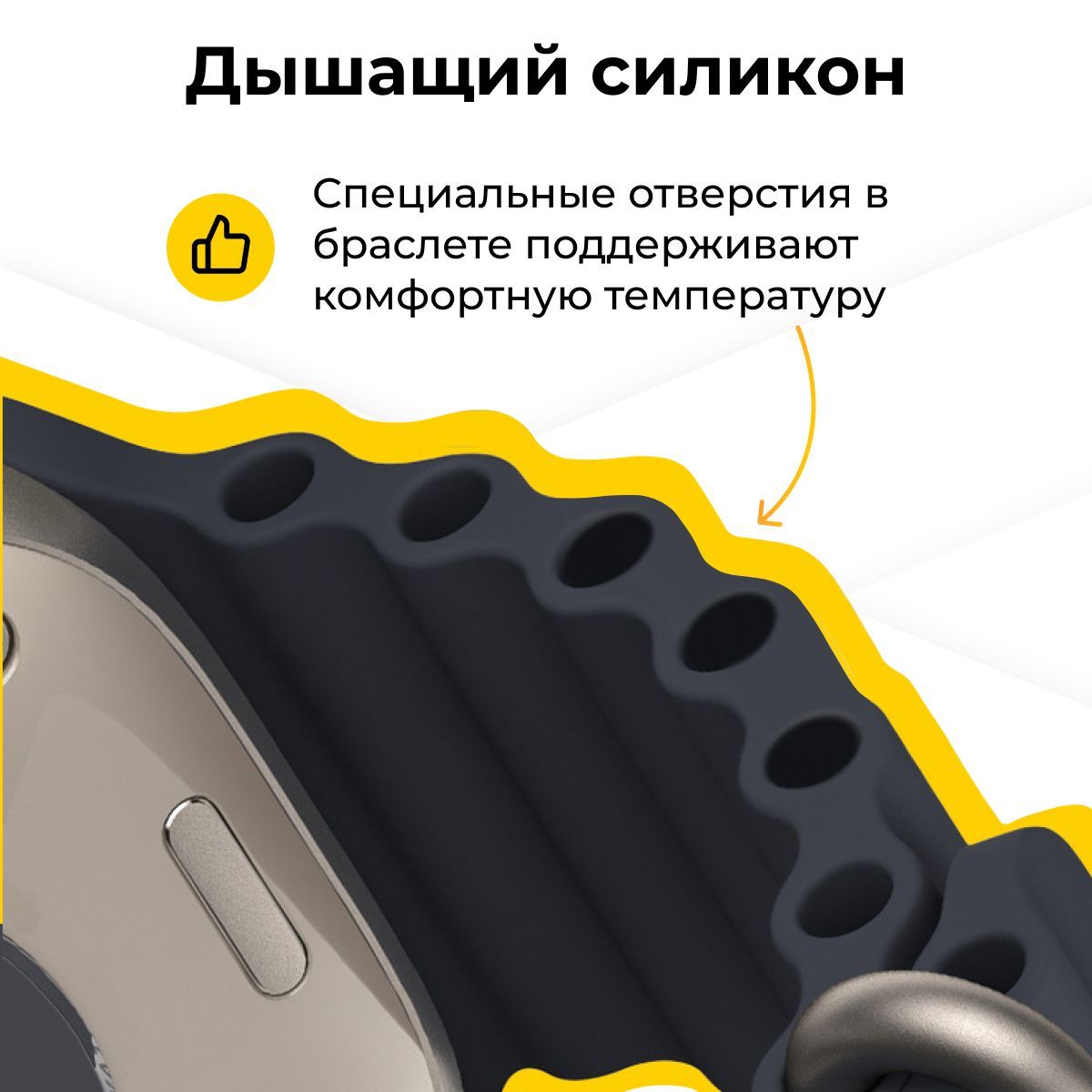 Описание: Apple Watch Ocean Band - стильный и функциональный аксессуар, разработанный специально для Apple Watch. Этот ремешок изготовлен из высококачественного мягкого силикона, который обеспечивает комфортное ношение на протяжении всего дня. Apple Watch Ocean Band легко устанавливается на ваш часовой корпус и надежно закрепляется с помощью инновационной застежки, которая обеспечивает безопасное ношение во время физической активности и повседневных дел. Мягкий силиконовый материал устойчив к влаге, пыли и износу, что делает его идеальным выбором для активного образа жизни. Вы можете носить его во время тренировок, плавания или других физических нагрузок без беспокойства о повреждениях.