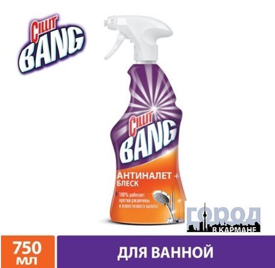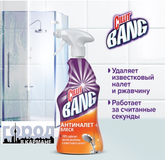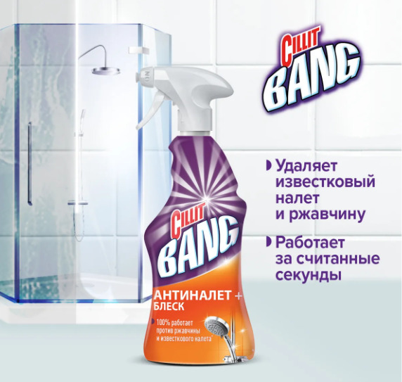 Описание: Силит. Для ванной. Мощное средство Cillit Bang Антиналет+ Блеск. BANG и грязи как не бывало! Попробуйте по-настоящему мощное средство CILLIT BANG антиНАЛЕТ+БЛЕСК! Оно эффективно удаляет известковый налет, мыльные разводы, ржавчину и въевшуюся грязь! Чистые поверхности блестят как новые! Идеально подходит для уборки ежедневных или стойких загрязненй, для различных материалов (в том числе керамика, акрил) и поверхностей, таких как ванная, душевая кабина, кафельная плитка, подоконники и др.