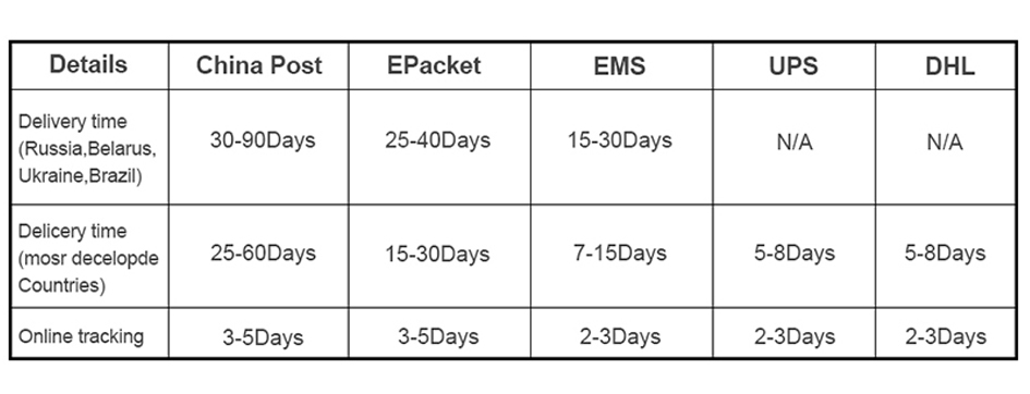 1), как правило, мы предлагаем бесплатную доставку авиапочтой Китая. Здесь мы делаем арбитр сроки доставки указаны только для справки, пожалуйста, посмотрите перед тем, как сделать заказ.