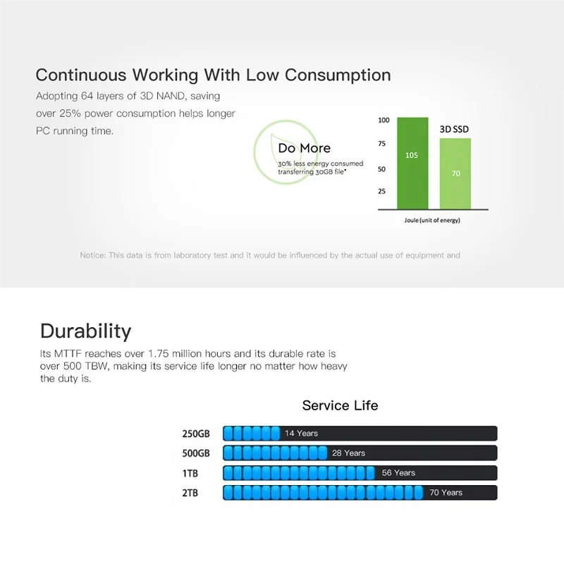 SSD разработан без движущихся частей, чтобы защитить от потери данных при случайном ударе или падении. И с 1,75 млн часов MTTF (среднее время до отказа) 4, до 500 ТБВт (записанных терабайт) 5 и несколькими технологиями исправления ошибок, SSD-накопители WD Blue 3D NAND SATA могут помочь защитить данные на долгие годы.