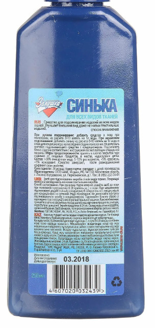 Описание: Производство ЗОЛУШКА (Россия) Вес брутто: 0,25 кг Для ручного и машинного подсинивания Объем: 250 мл Средство для подсинивания изделий из всех видов тканей. Улучшает внешний вид даже неновых текстильных изделий.