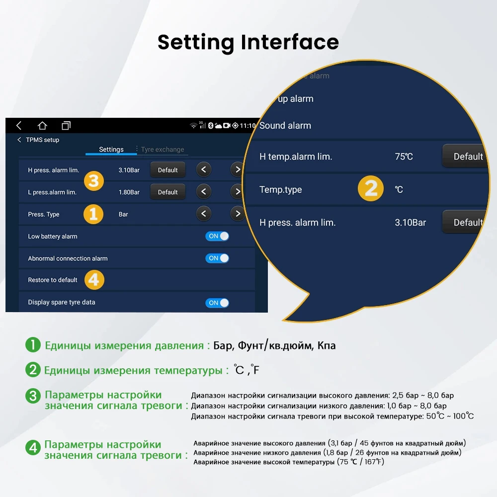 Будильник, когда температура шин выше 68 ℃ (значение по умолчанию);
