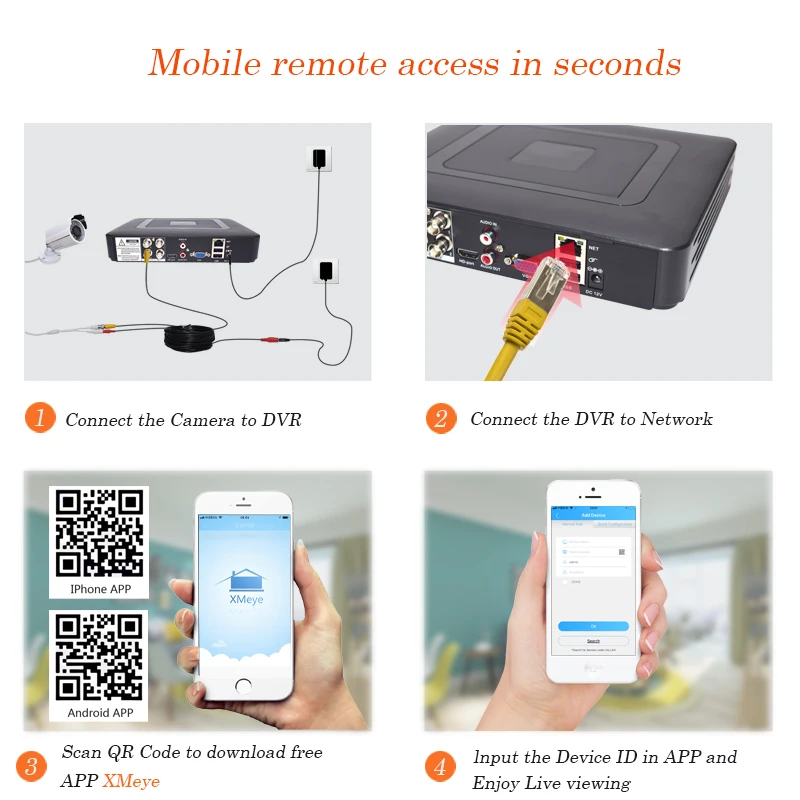 Простая настройка, всего 4 шага для просмотра мобильный телефон (Android и iPhone iOS)Поддержка нескольких устройств, несколько устройств для добавления вида
