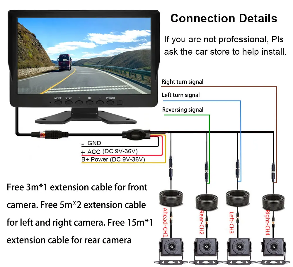 Установите четыре камеры AHD спереди, слева, справа и сзади автомобиля, отдельно Подключите их к монитору. Затем Подключите другие кабели в нужное положение. Наконец, вам понравится монитор вождения в реальном времени, помощь при вождении, монитор парковки и воспроизведение видео в любое время и в любом месте. (Примечание: если вы не профессионал, пожалуйста, обратитесь в автомагазин за помощью в установке.)