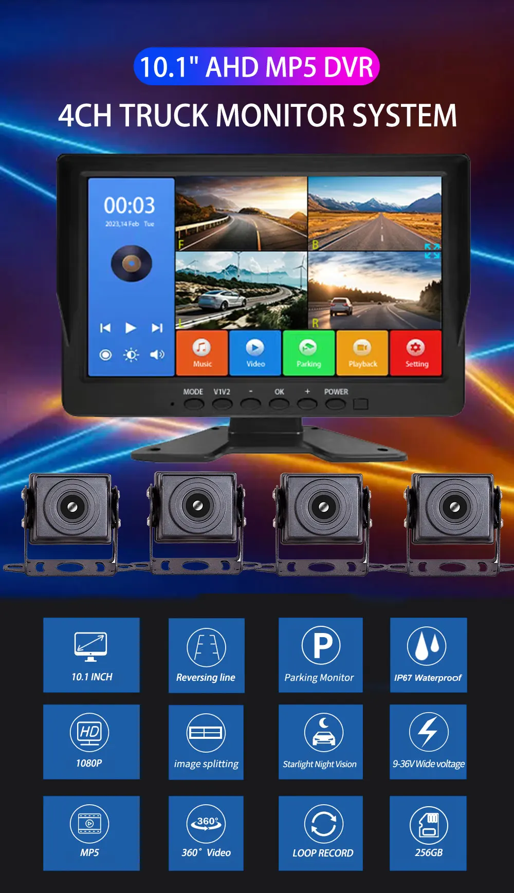 Поддержка широкого напряжения 9-36 В, действительно идеальная система для наблюдения за автомобилями, подходящая для небольших грузовиков, автобусов, пикапов, рабочих автомобилей, больших грузовиков и т. Д.