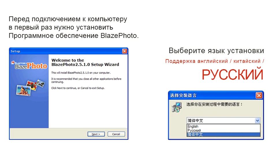 Перед первым подключением к компьютеру вам необходимо установить программу BlazePhoto.
