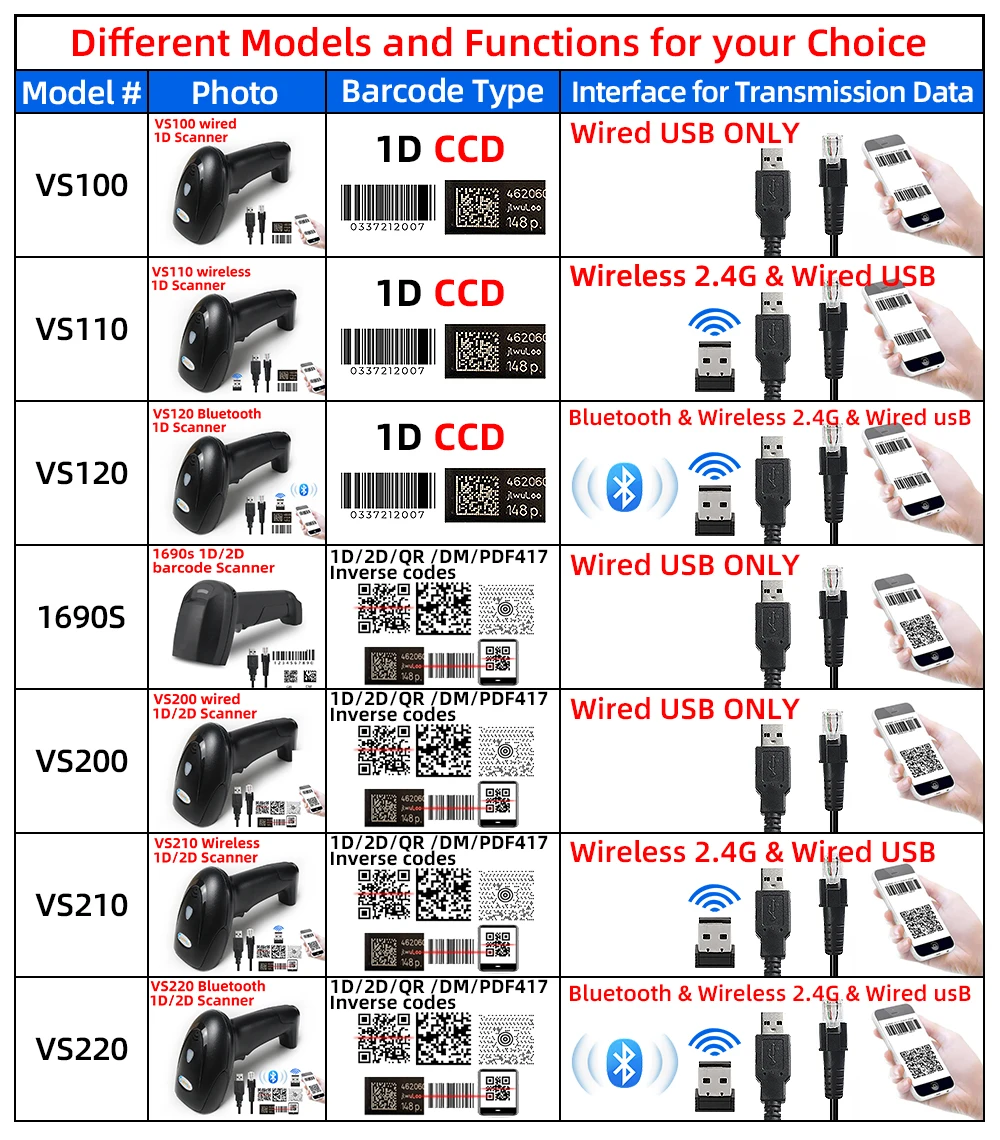Друг, наши сканеры штрих-кода бывают различных моделей и функций. Пожалуйста, выберите в соответствии с вашими потребностями при покупке, как указано в таблице ниже. Если вы допустили ошибку, немедленно свяжитесь с нами или отмените заказ и совершите покупку снова. Спасибо вам за ваше одобрение.