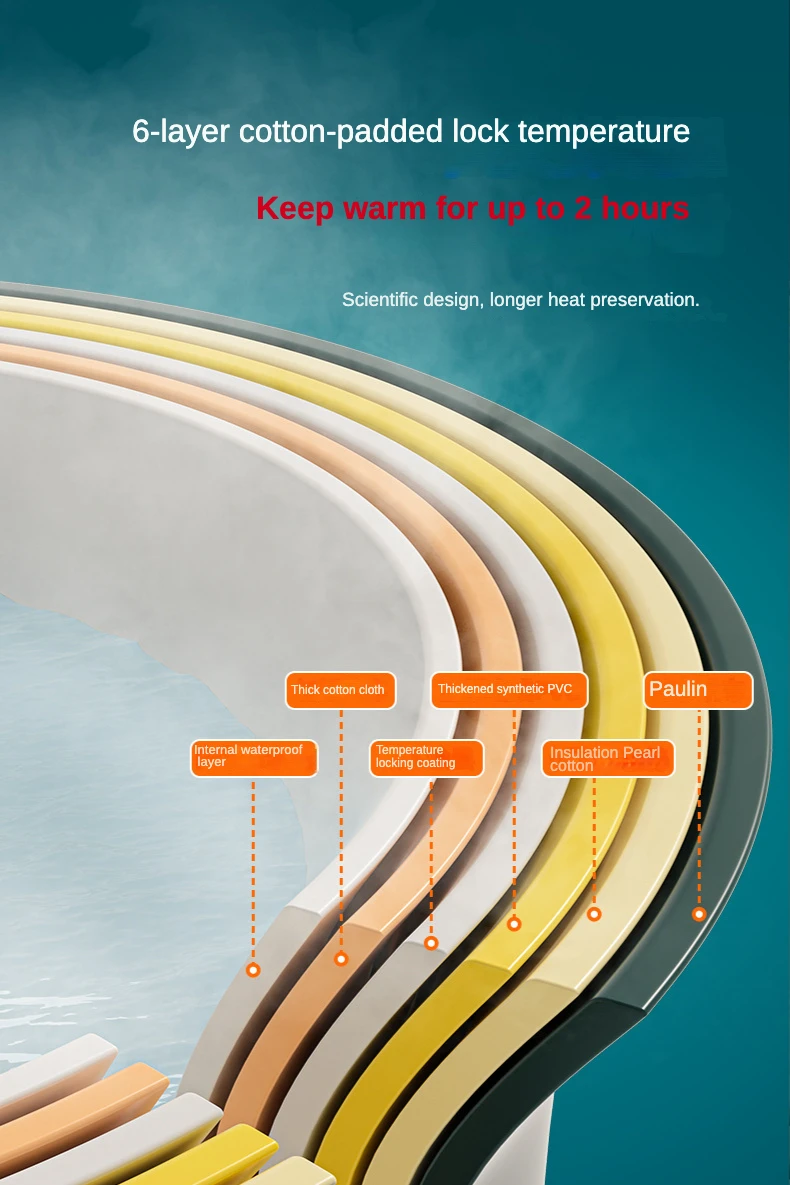 2, 6 слоев утолщенной конструкции (водонепроницаемый слой + теплоизоляционная краска + Теплоизоляционный жемчужный хлопок + синтетический ПВХ + толстый хлопок + водонепроницаемый холст), могут поддерживать температуру воды в течение 2 часов