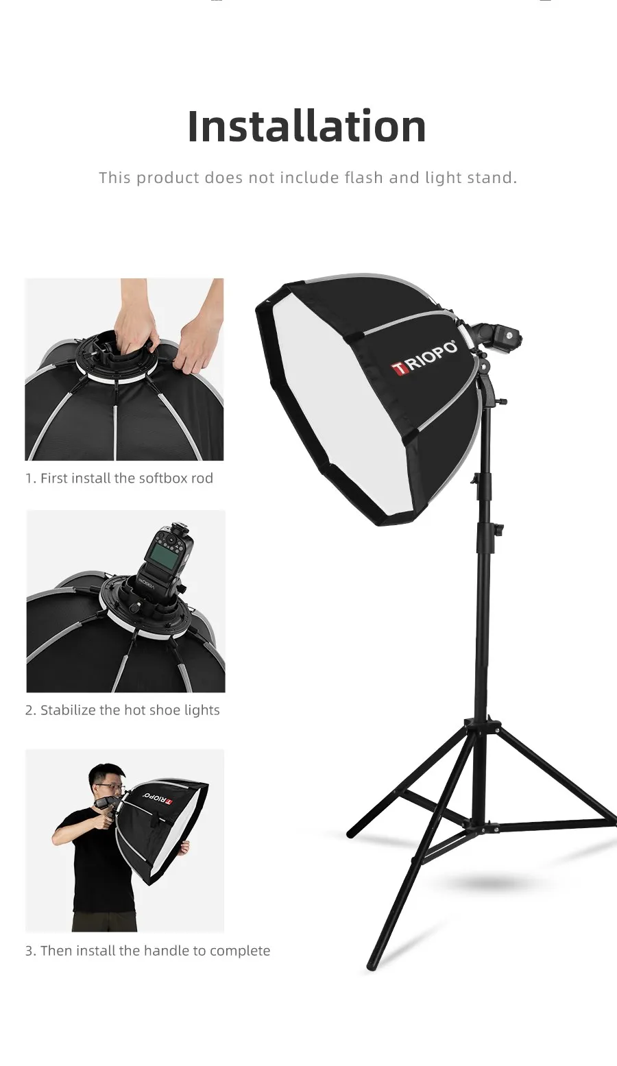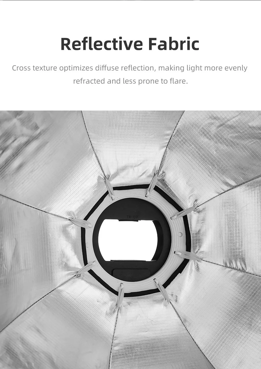 1. Внутри с отражающим серебром и поставляется с передним полупрозрачным диффузором, отлично подходит для speedlite, monolight, strobe или slave.