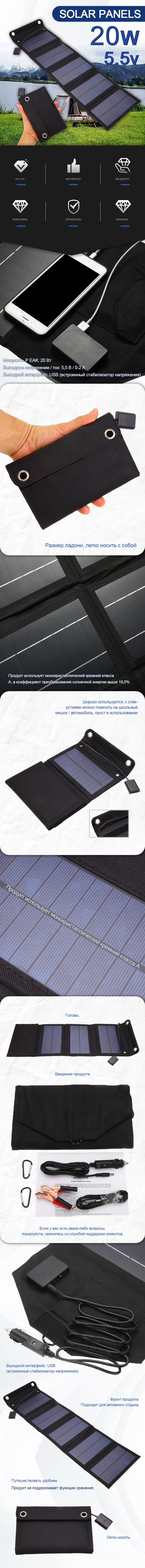 Складные солнечные панели, водонепроницаемое зарядное устройство на солнечных батареях, 20 Вт, 5 В, 2 А, USB-выход, портативные, для отдыха на открытом воздухе, кемпинга, туризма
