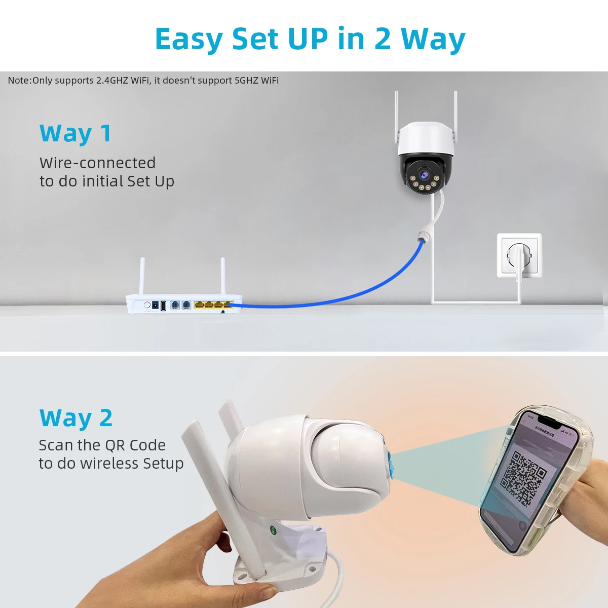 Работает от адаптера DC12V, вы можете подключить камеру к сети Wi-Fi. Вы можете настроить Wi-Fi-соединение камеры или поиск по локальной сети с помощью сетевого кабеля, подключенного к маршрутизатору, работать только с Wi-Fi 2,4G (не поддерживает 5G)