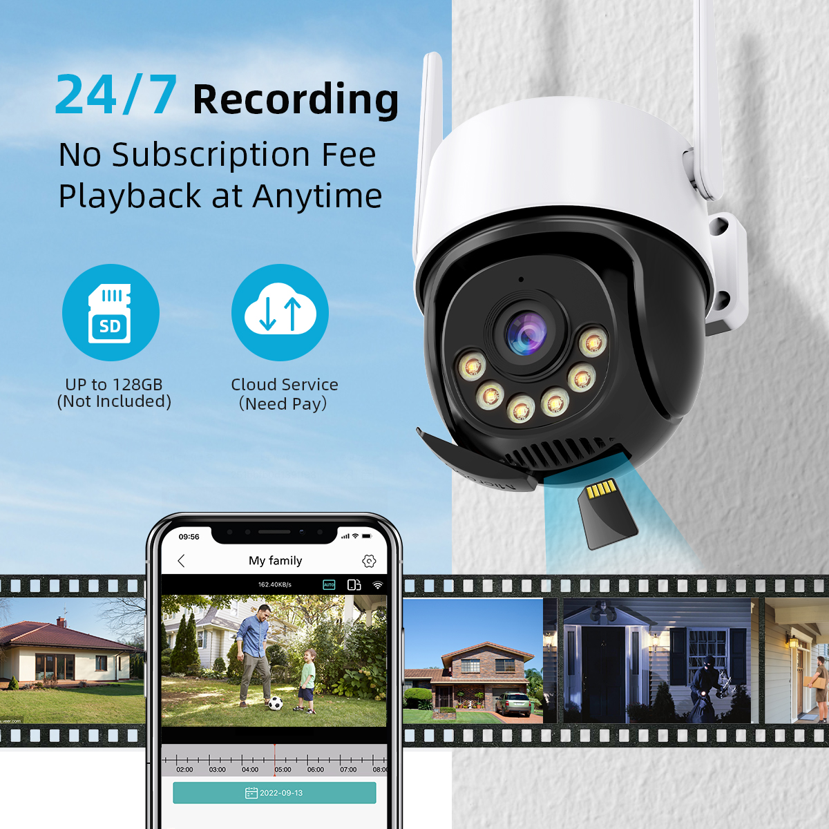 Вставьте SD-карту, это полная Удаленная домашняя система безопасности, записывающая видео 24*7 или только события движения и легко воспроизводящая в приложении для телефона (поддержка карты Micro SD 16 ~ 128G, карта не входит в комплект), облачное хранилище нужно покупать в приложении.