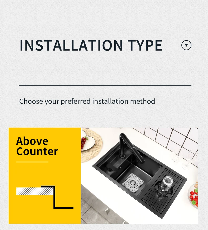 Installation method Above Counter,Apron Fron,Semi-recessed undercounter/Undermount