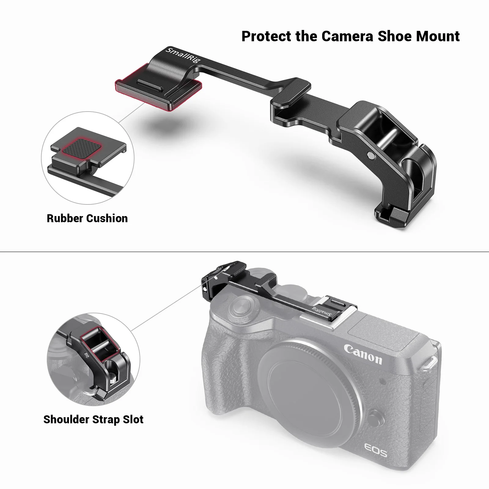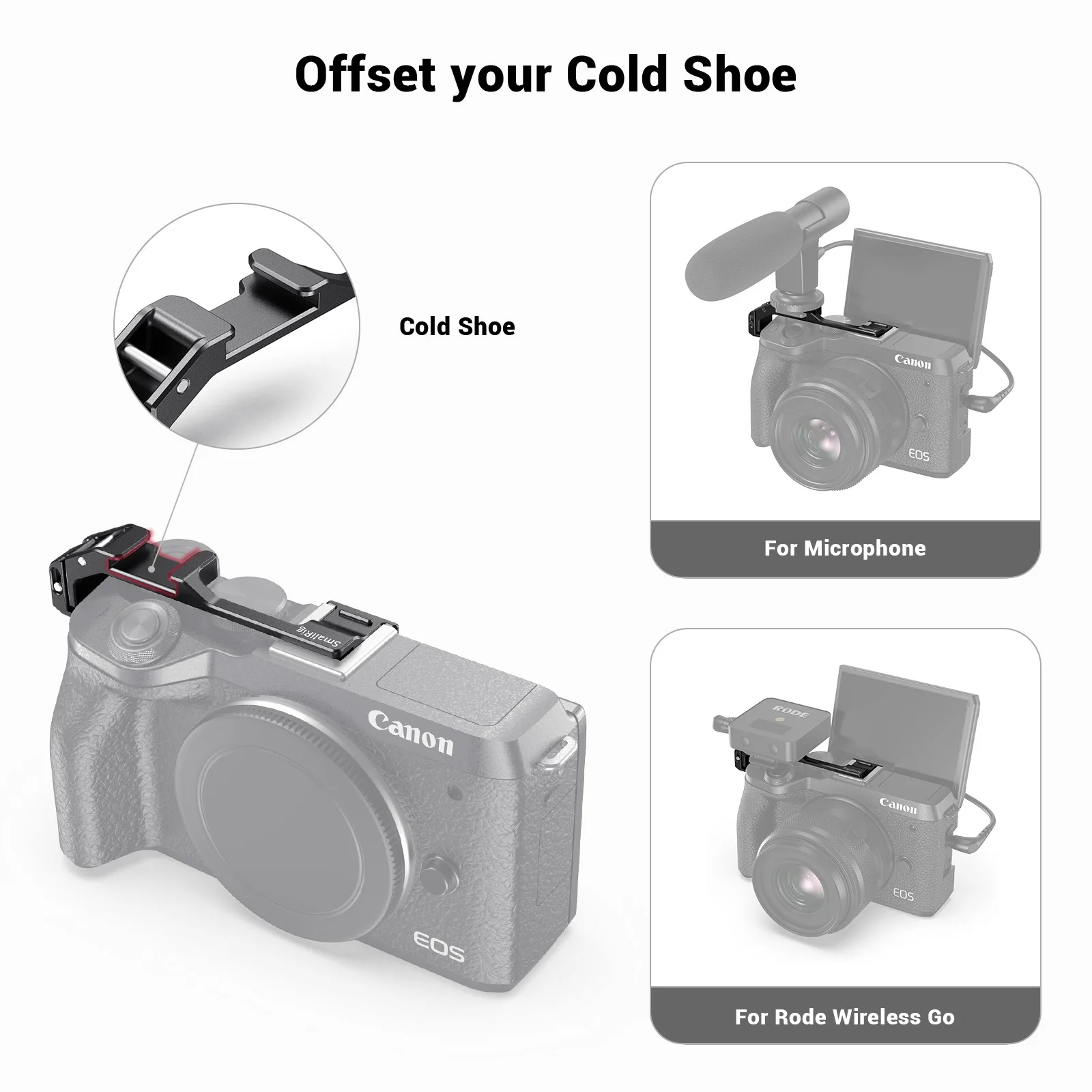 SmallRig Vlogging Холодный башмак пластина перемещения для Canon EOS M6 Mark II BUC2627Перемещает крепление обуви от центра к правой стороне камеры. При перемещении крепления обуви на боковую сторону аксессуары не попадают в складку ЖК-экрана, что особенно полезно, если вы снимаете с передней части камеры для видеосъемки или селфи. Пластина устанавливается в крепление для обуви вашей камеры и отверстие для правого ремешка, с винтом M2.5, фиксирующим его на месте. Он также поставляется с резиновой прокладкой, которая предотвращает любую Потертость. Пластина Низкопрофильная и может постоянно оставаться на камере для хранения.