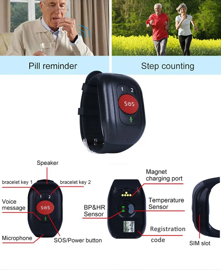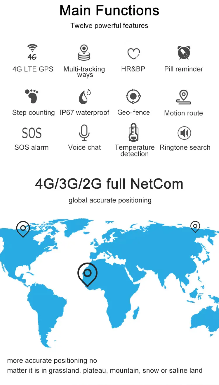 Наш браслет 4G GPS работает стабильно во всем мире, он имеет практические функции, такие как мониторинг сердечного ритма, Мониторинг Артериального Давления, мониторинг температуры, аварийная тревожная кнопка SOS, голосовая речь, напоминание о таблетках, шаг подсчета и т. д.