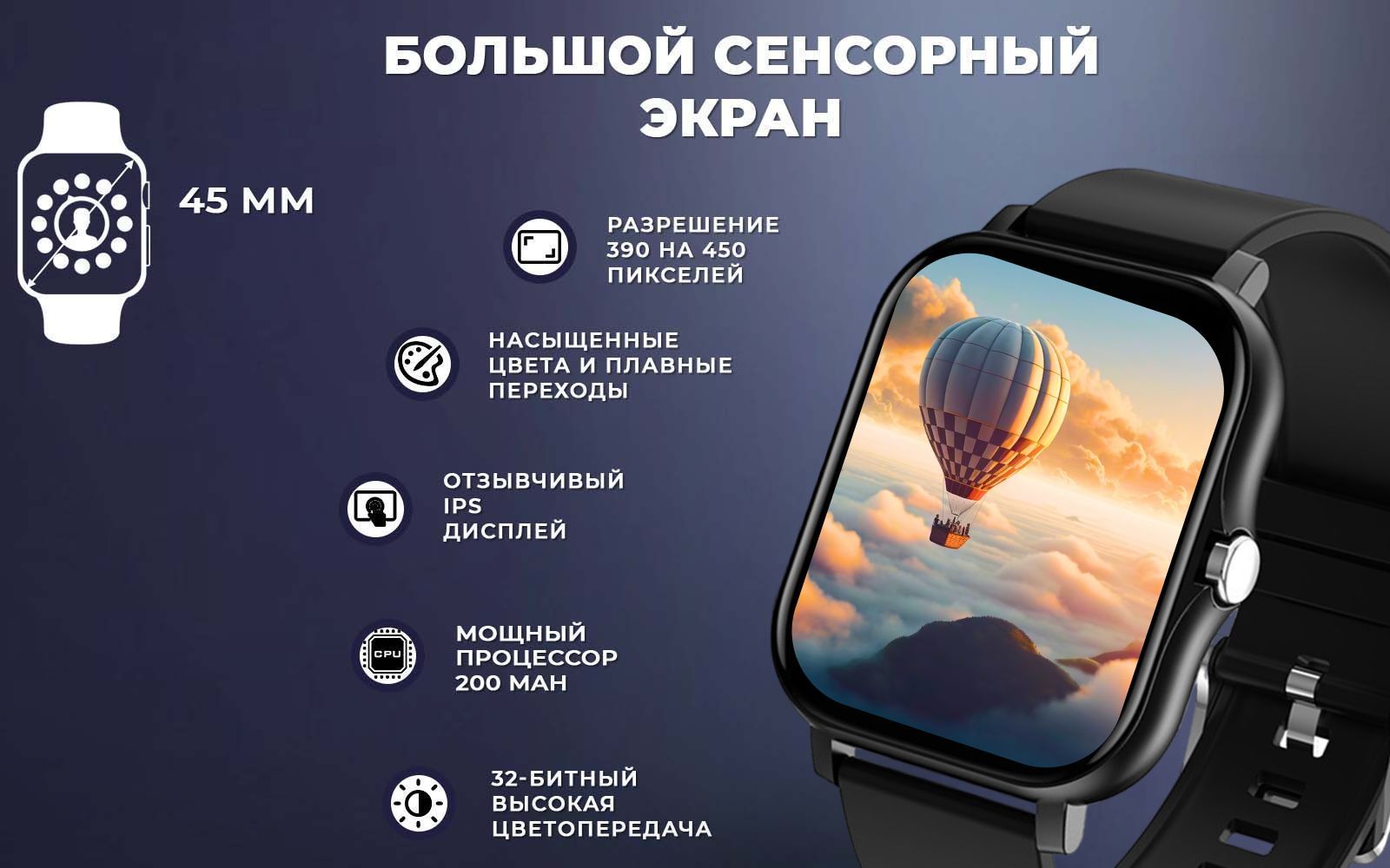 Часы имеют: множество функций, выбор циферблатов, производительный чип Bluetooth 5.2, отзывчивый сенсор, качественную синхронизацию со смартфонами на платформах Android и iOS совместно с приложением FitPro.Погрузись в атмосферу качества и насладись картинкойСмарт часы имеют яркий IPS экран с высокой цветонасыщенностью и диагональю 2,1 дюйма. Размер циферблата 45 мм.