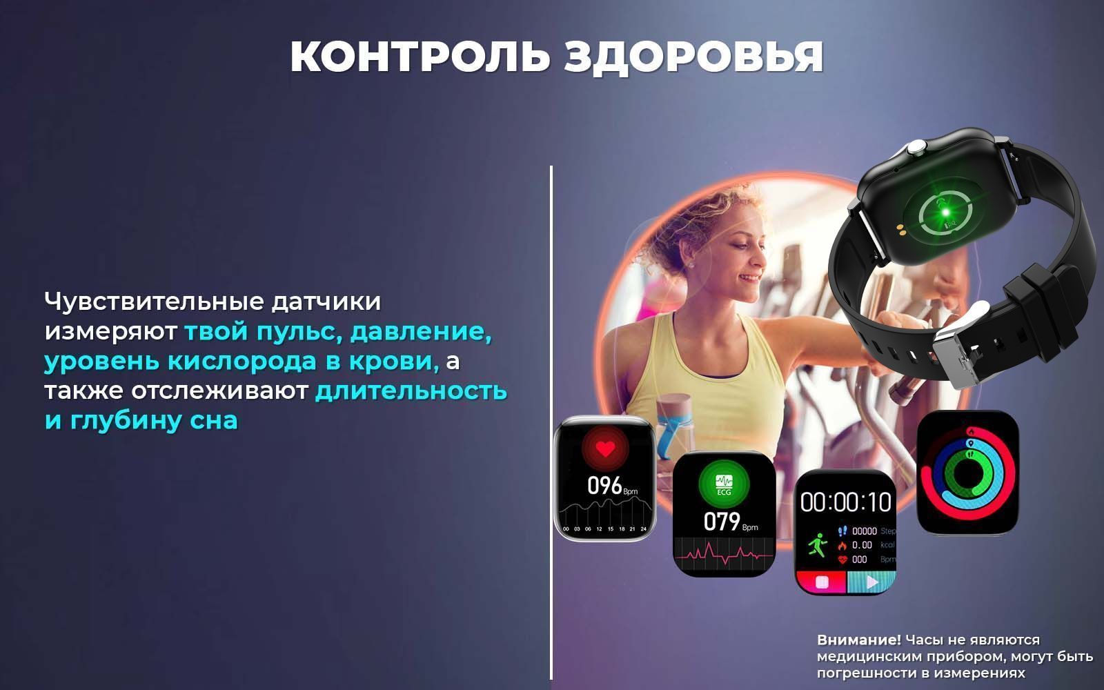 Дополнительно можно скачать множество бесплатных циферблатов на любой вкус. При этом ты всегда имеешь возможность устанавливать свои картинки на главные обои смарт вотч через функцию "Пользовательский интерфейс".Контролируй свои показателиНаручные электронные смарт часы оснащены чувствительными датчиками, которые могут измерять твою частоту сердцебиения (пульс), давление и уровень кислорода в крови.