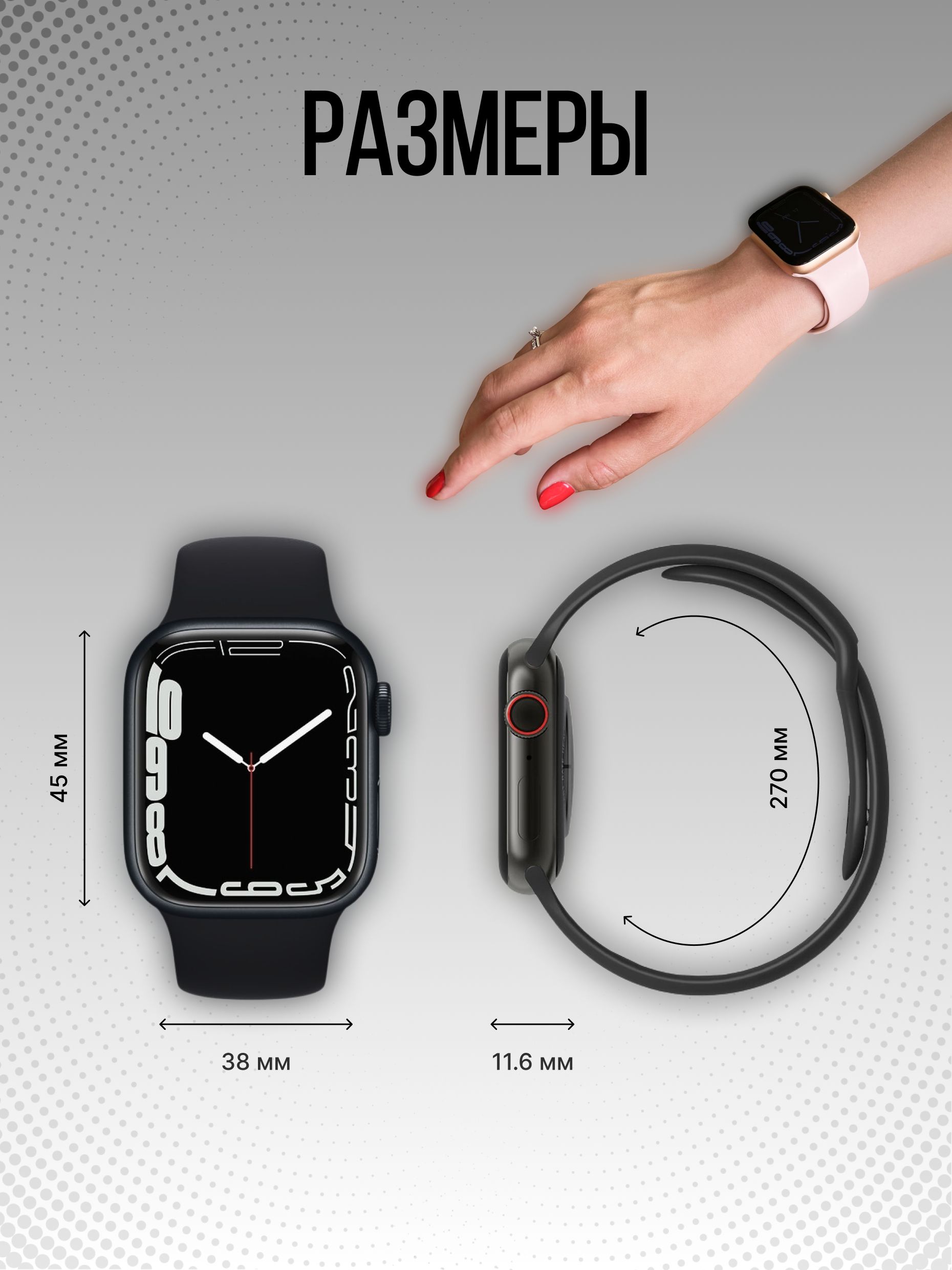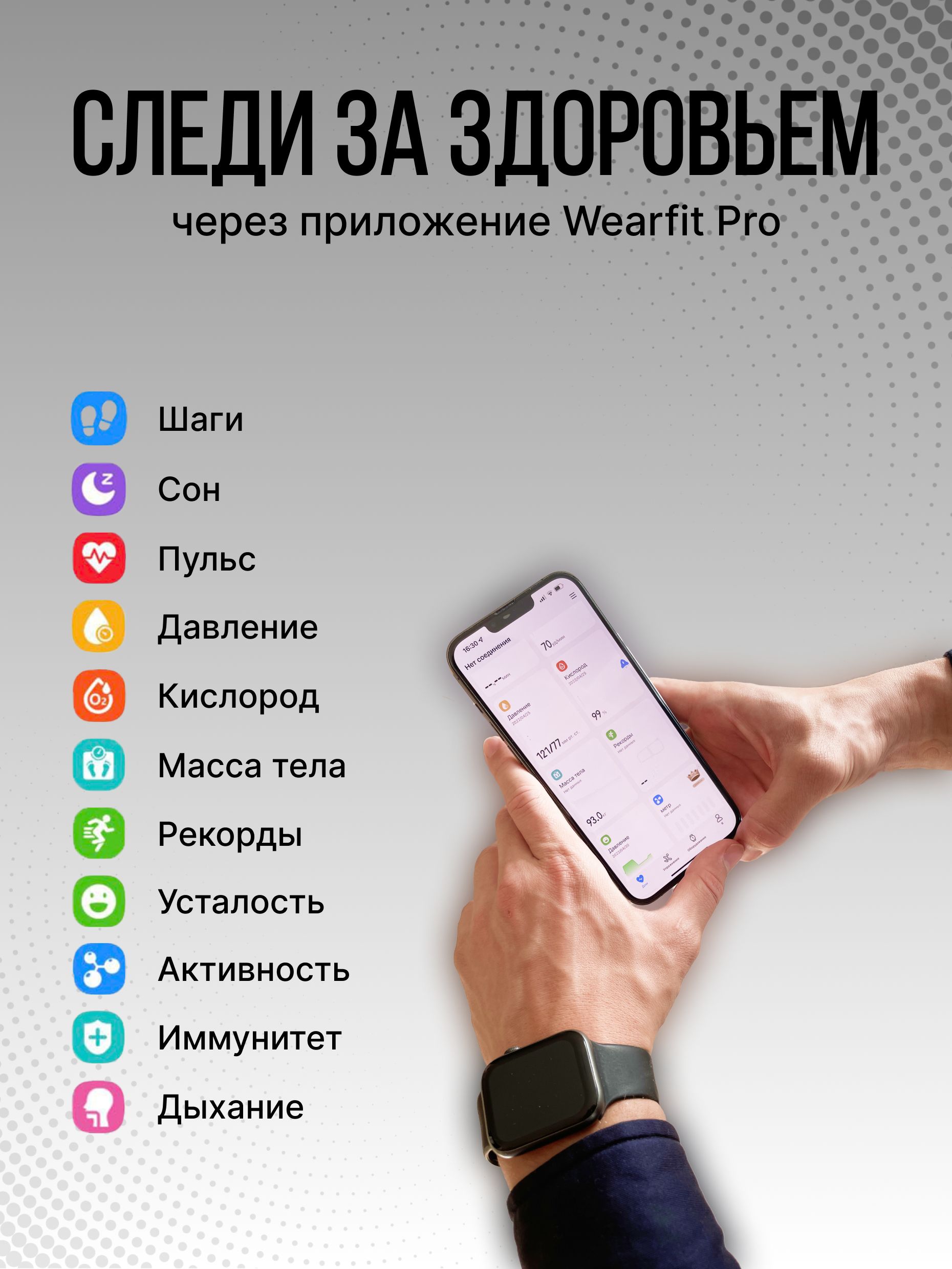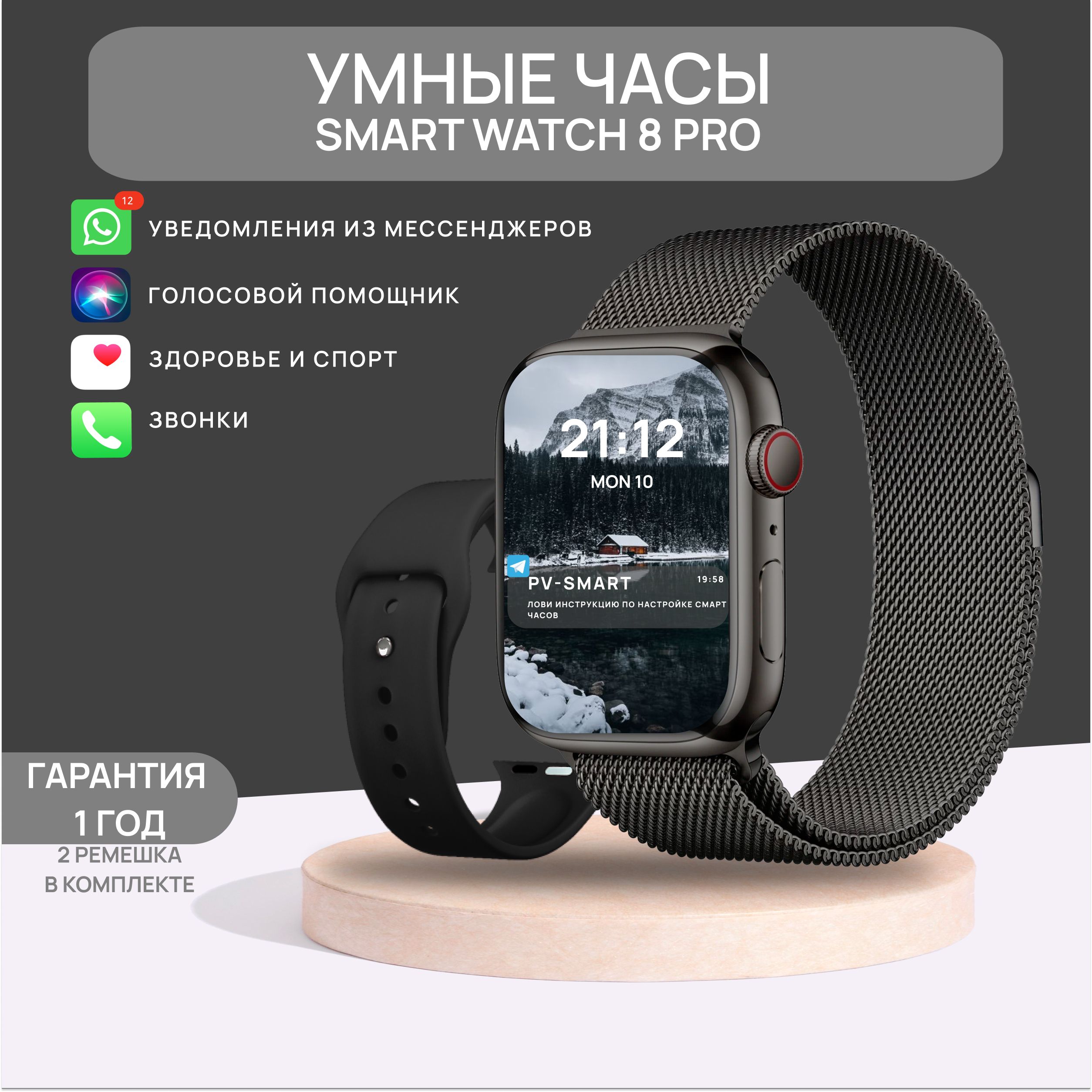 Описание: Модель X8 PRO. Smart часы 8 серии с диагональю 45 мм - незаменимый аксессуар, позволяющий всегда оставаться на связи! Цифровые наручные часы имеют универсальный дизайн, а значит отлично подойдут как для мужчин, так и женщин. В комплекте с наручными часами идет беспроводная зарядка, инструкция и два браслета: силиконовый - для повседневного образа или спортивных тренировок и металлический (миланская петля) - для более делового стиля,. Размер ремешка регулируется по запястью. Электронные умные часы оснащены микрофоном и динамиком, приходят уведомления, управление камерой, мониторинг сна, будильник, звонки, управление музыкой, сообщения, голосовой помощник - все это у вас на руке. Смарт гаджет заботится о вашем здоровье в режиме реального времени: измеряет артериальное давление, мониторит уровень кислорода в крови, контролирует частоту пульса, анализирует качество сна. Но стоит понимать если Вам необходимо точное измерение - необходимо воспользоваться специальным медицинским оборудованием. Смарт часы лишь показывают приблизительные данные. Смарт часы включают в себя: счётчик калорий, шагомер, пульсометр, 12 спортивных режимов, поэтому смело заменят любой фитнес браслет. Детские часы при активном пользовании держат заряд до двух дней, а в режиме ожидания - до 5 дней. Электронный гаджет на руку имеет безрамочный, сенсорный, изогнутый экран диагональю 1,95 дюйма, обеспечивающий насыщенный цвет и высокое разрешение. Часы с браслетом обладают влагозащитой IP67, что оберегает их от влаги и пыли, но не спасает от погружения в воду! Внимание! Здравствуйте! Смарт часы нельзя использовать для глубоких погружений и длительного замачивания в воде. Кроме того, часы не устойчивы к горячей воде, потому что горячий пар воздействует на ремешок, поэтому душ в них также не рекомендуется принимать. Но в часах можно смело мыть руки, попасть под дождь, уронить их на небольшую глубину и быстро достать, забрызгать жидкостью. Сенсорные смарт часы подключаются к телефону через Bluetooth 5.0 и выше с помощью приложения Wearfit Pro, которое доступно для IOS (айос) и Android (андроид). Smart watch 8 послужат отличным подарком на День Рождения, 14 февраля, 8 марта, и просто подарок для любимой или любимого, а также ребенку. Подарок к 1 сентября.