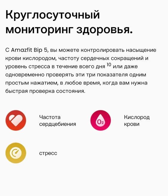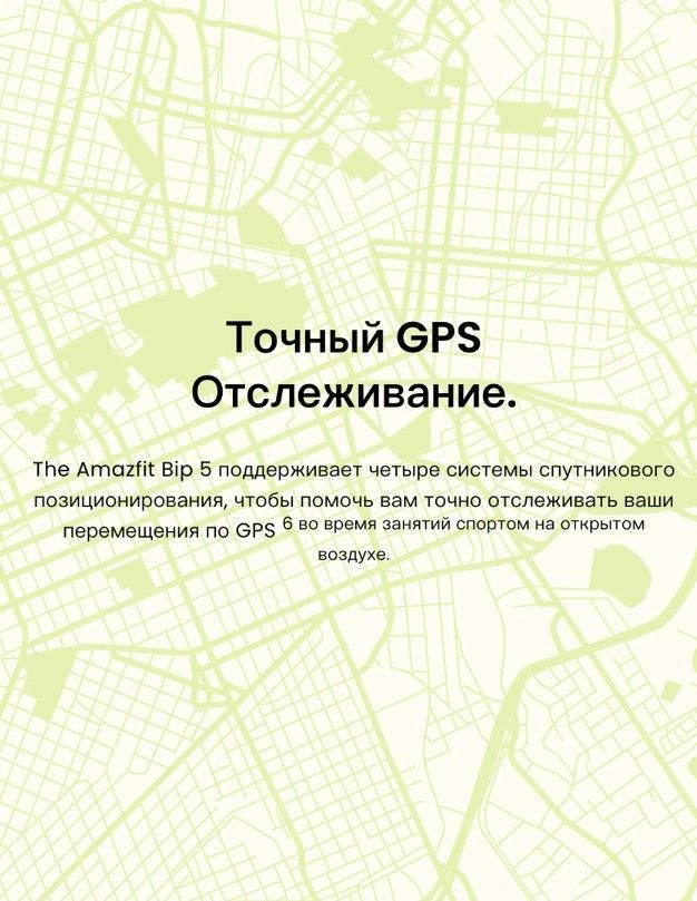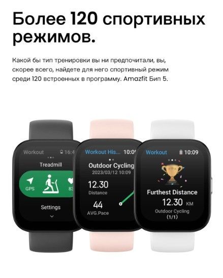 Описание: Умные часы Amazfit Bip 5Великолепные умные часы открывают перед вами волшебный мир, где отслеживание здоровья становится искусством. Здесь технология переплетается с элегантностью, а функциональность с высоким уровнем точности. Волшебные аккомпанементы на пути к совершенству, где изысканная технология переплетается с виртуозной элегантностью. Этот захватывающий артефакт воплощает в себе бесконечные возможности и удивляет своей многофункциональностью.1,91-дюймовый дисплейВеличественный 1,91-дюймовый TFT-дисплей Amazfit Bip 5 обрамлен закалённым стеклом 2,5D, что придает часам уникальный облик и гарантирует их непревзойденную прочность. Здесь, на этом бесконечном экране с разрешением 320×380 пикселей, вы откроете для себя целый мир спортивных возможностей и здорового образа жизни.120 спортивных режимовИзящество не забывает о спортивных страстях – Amazfit Bip 5 раскроет перед вами портал к свыше 120 спортивным режимам, перенося вас в мир тренировок с атмосферой абсолютного вдохновения. Это воплощение красоты и умения, а его амплитуда функциональности сотрется гранью реальности и загрузит вас в мир изысканных возможностей.GPS система позиционированияAmazfit Bip 5 оснащен системой позиционирования с 4 спутниками, которая великолепно улавливает ваше местоположение в пространстве. Это позволяет создать карточку вашей активности, на которой каждый ваш шаг, бег или пробежка записаны с абсолютной точностью. Вы просто завершите каждую тренировку на вершине совершенства.Мониторинг здоровьяСекрет магического отслеживания здоровья заключается в биометрическом датчике BioTracker PPG, который с мастерством анализирует ваш пульс и вариации сердечного ритма. Такое предельное внимание к деталям позволяет уловить каждый момент вашего сердцебиения и перевести его в язык здоровья.26 дней автономной работыСекунды виртуозно сливаются с часами, благодаря аккумулятору емкостью 300 мАч, который умело поддерживает до 5 дней активного использования. Но здесь не иссякнут чудеса – умеренный режим раскроет потенциал до 10 дней, а режим энергосбережения удивит вас своим волшебством, таинственно протянув батарею до удивительных 26 дней.