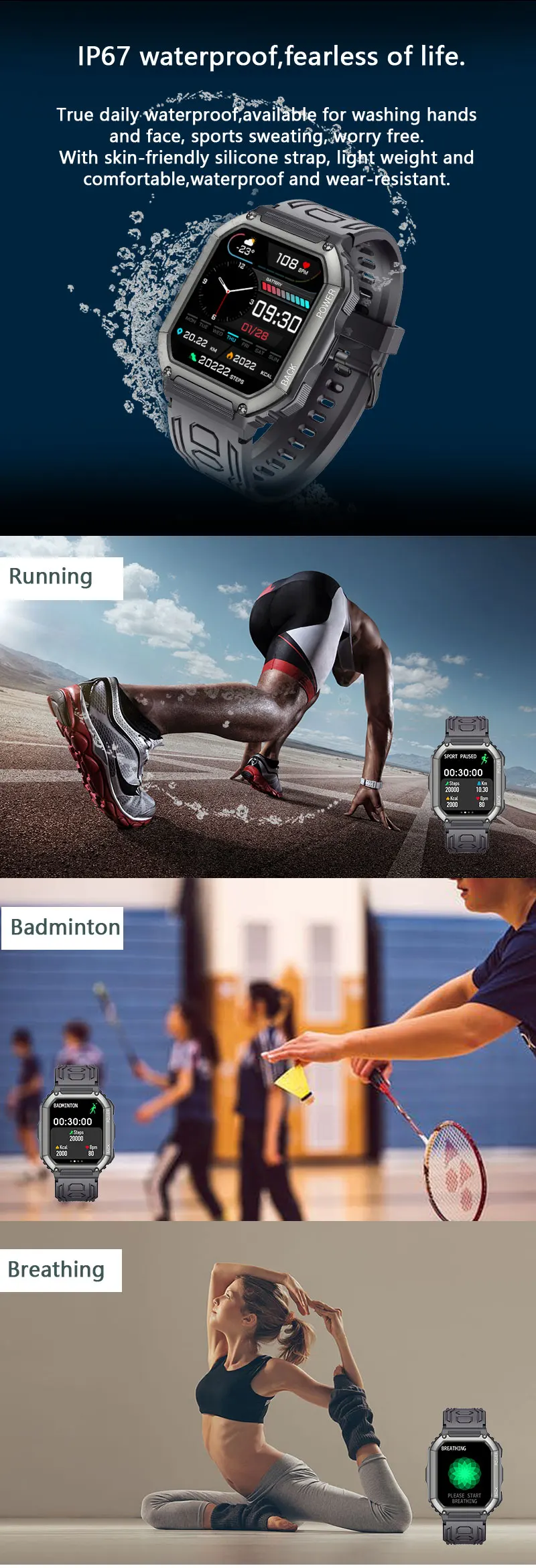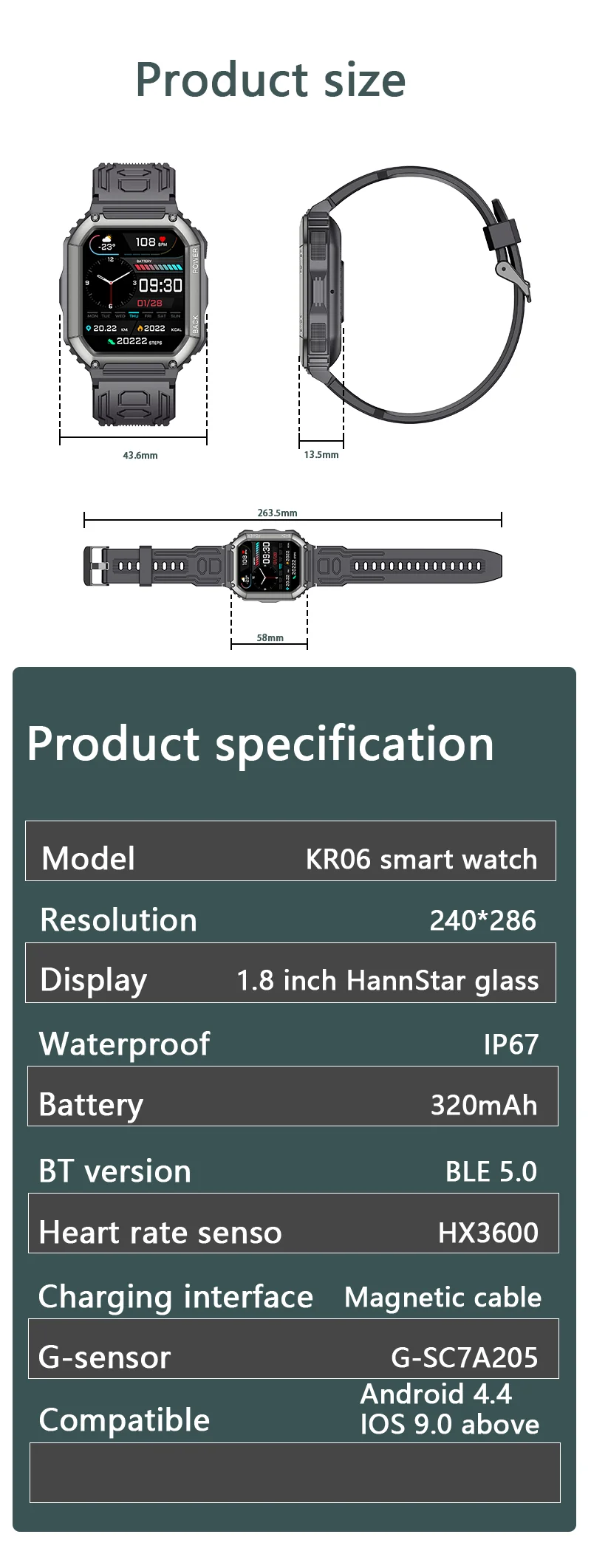 * Больше функций: Рынок циферблатов, пользовательские циферблаты, погода, управление камерой, управление музыкой, режим театра, секундомер, будильник, тренировка дыхания, сообщение, регулировка яркости, отключение звука, Функция разделения экрана