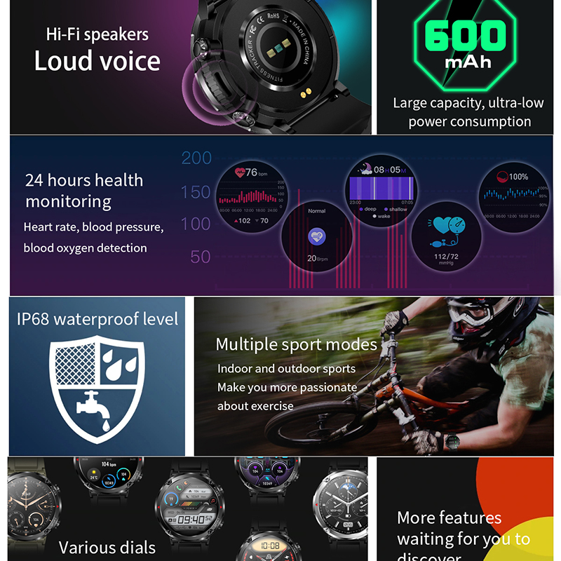 *Health Monitor:heart rate 、Blood pressure、sleep monitor、Blood oxygen measurement、 Breathing training.