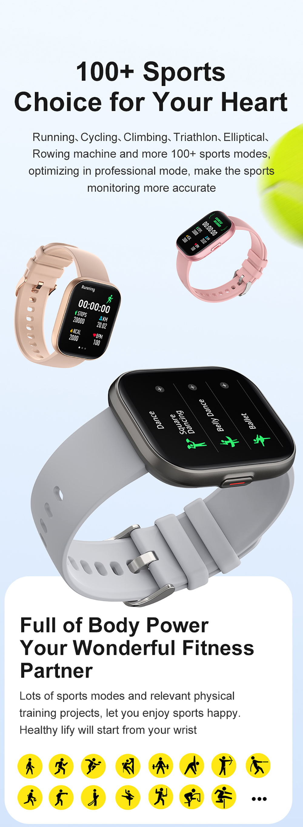 Отслеживание активности в течение всего дня (шаги, калории, расстояние), водонепроницаемость IP67, 106 режимов упражнений, отчет о спортивных данных.