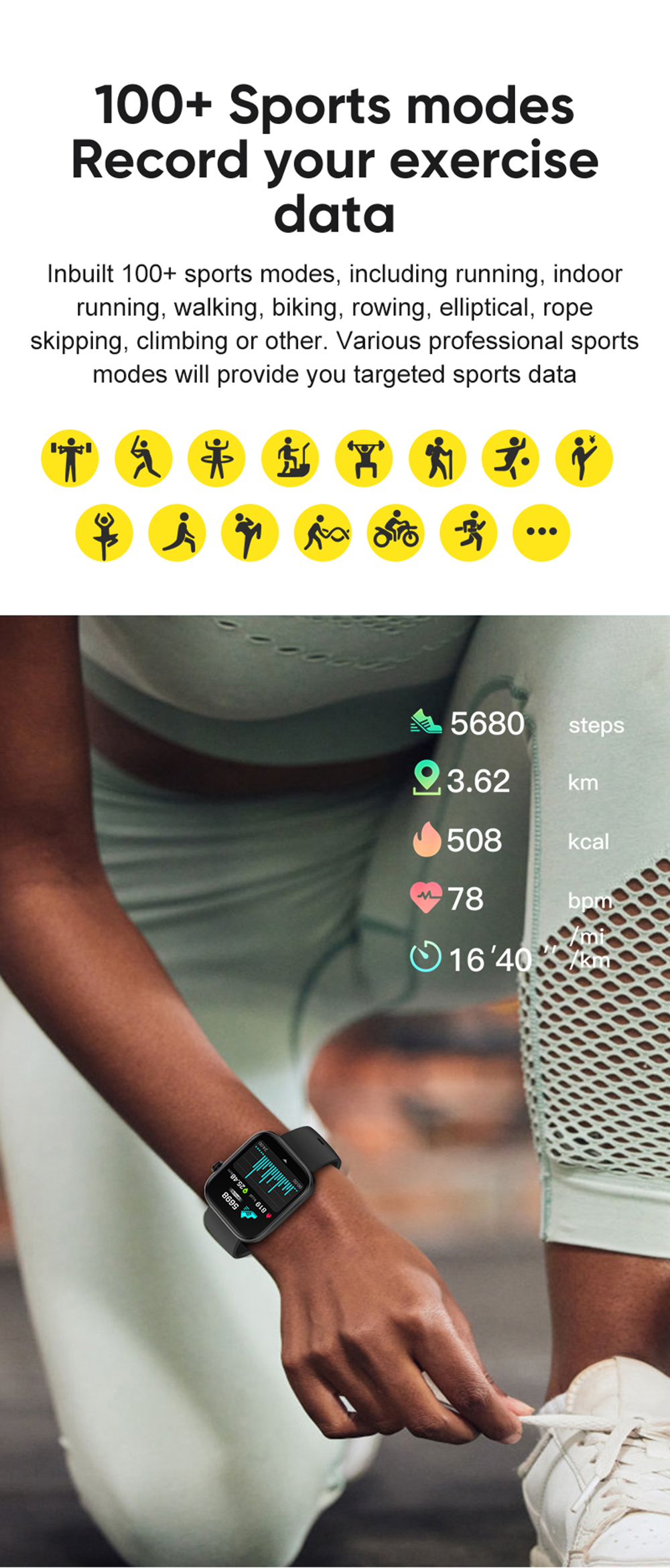 Запись активности (шаги, калории, расстояние), Спортивная цель, 100 + режимов упражнений, отчет о спортивных данных, водонепроницаемость IP68.