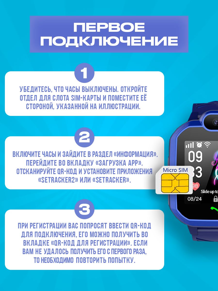 ВАЖНО! Сим карту нужно поместить в слот выключенных смарт часов, стороной показанной в инструкции первого подключения. Сим карта размера "micro Sim" и с тарифом, поддерживающим мобильный интернет 2G. Для корректной работы смарт часов советуем использовать SIM-карты операторов связи Мегафон, МТС и Билайн, с остальными могут возникнуть трудности