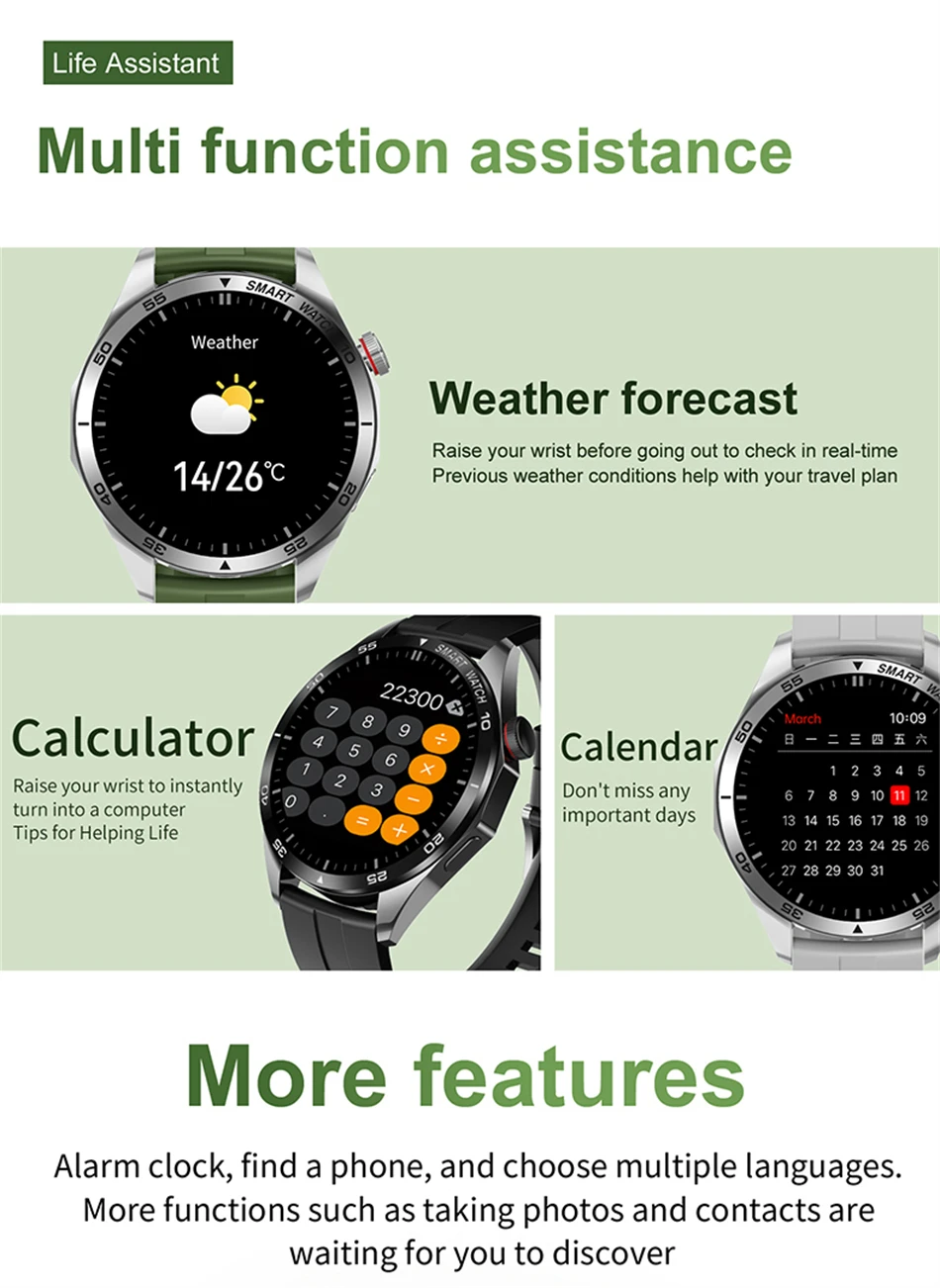 Основные функции: вызов Bluetooth, ЭКГ + PPG, запись упражнений (шагомер, расстояние, расчет калорий), режим упражнений, нажатие сообщения, хранение информации, монитор сердечного ритма, монитор сна, измерение артериального давления, измерение насыщения кислородом, секундомер, управление камерой, управление музыкой.