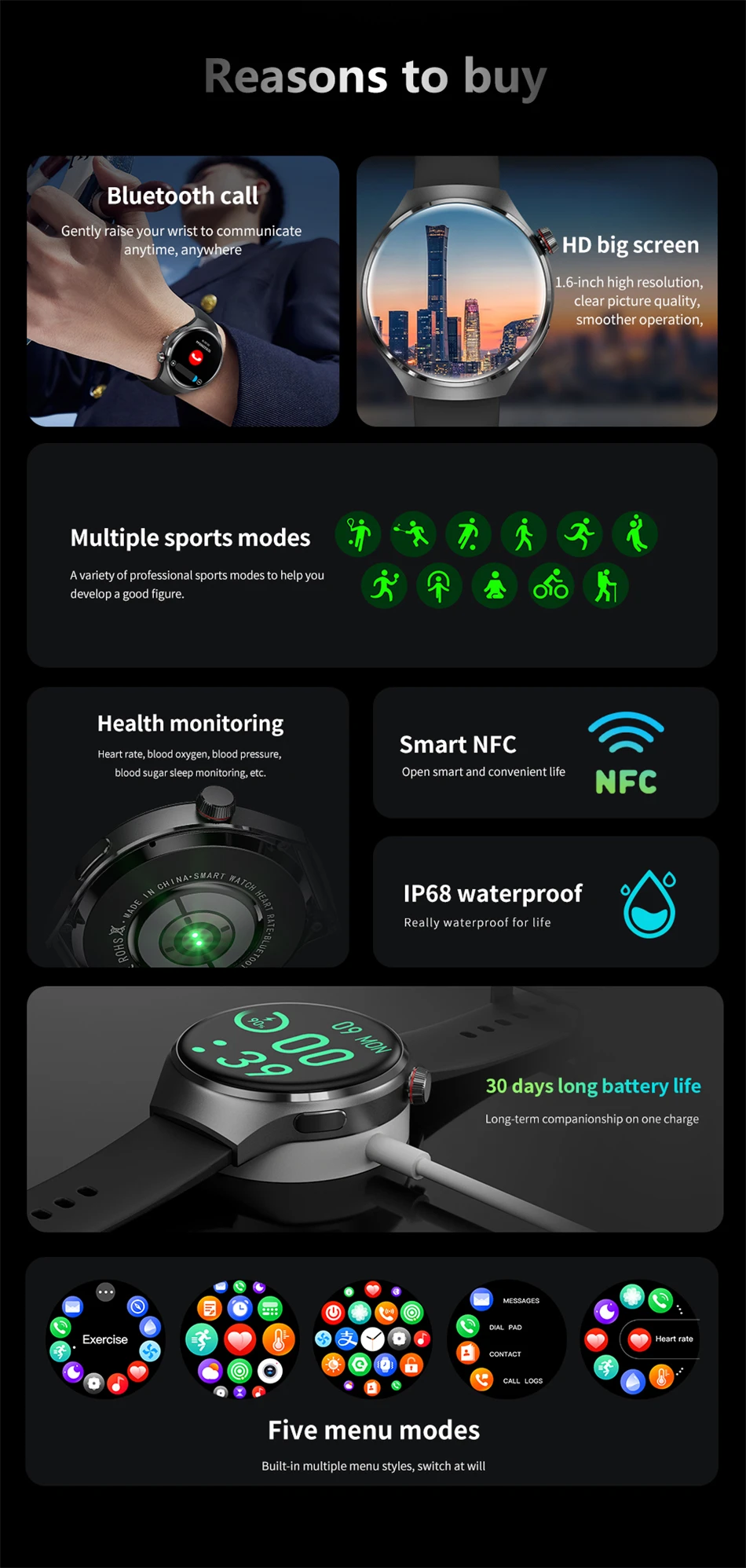 Dear friend, thank you very much for your support. This is a multifunctional sports smart watch! This product has many very useful features! For example, compass function, NFC function, you can open the door through the watch! Bluetooth call function, after connecting to the Bluetooth of the mobile phone, you can make calls directly through the watch! AI voice assistant function, turn on the watch function through voice! There are also some medical functions that can monitor heart rate, blood pressure, blood oxygen, and electrocardiogram! And watch your health! All of these are very useful features!