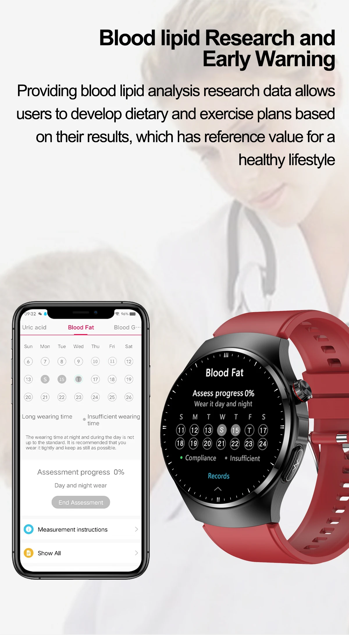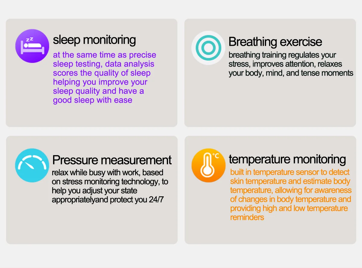 4. 24-часовой непрерывный динамический мониторинг сердечного ритма (с функцией обнаружения в реальном времени), мониторинг температуры тела, тестирование давления, независимый точный кислород в крови, мониторинг артериального давления и другие функции мониторинга здоровья.