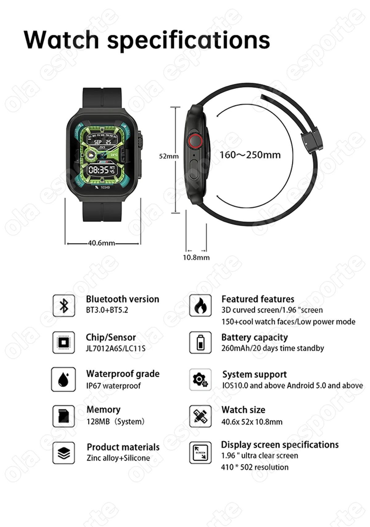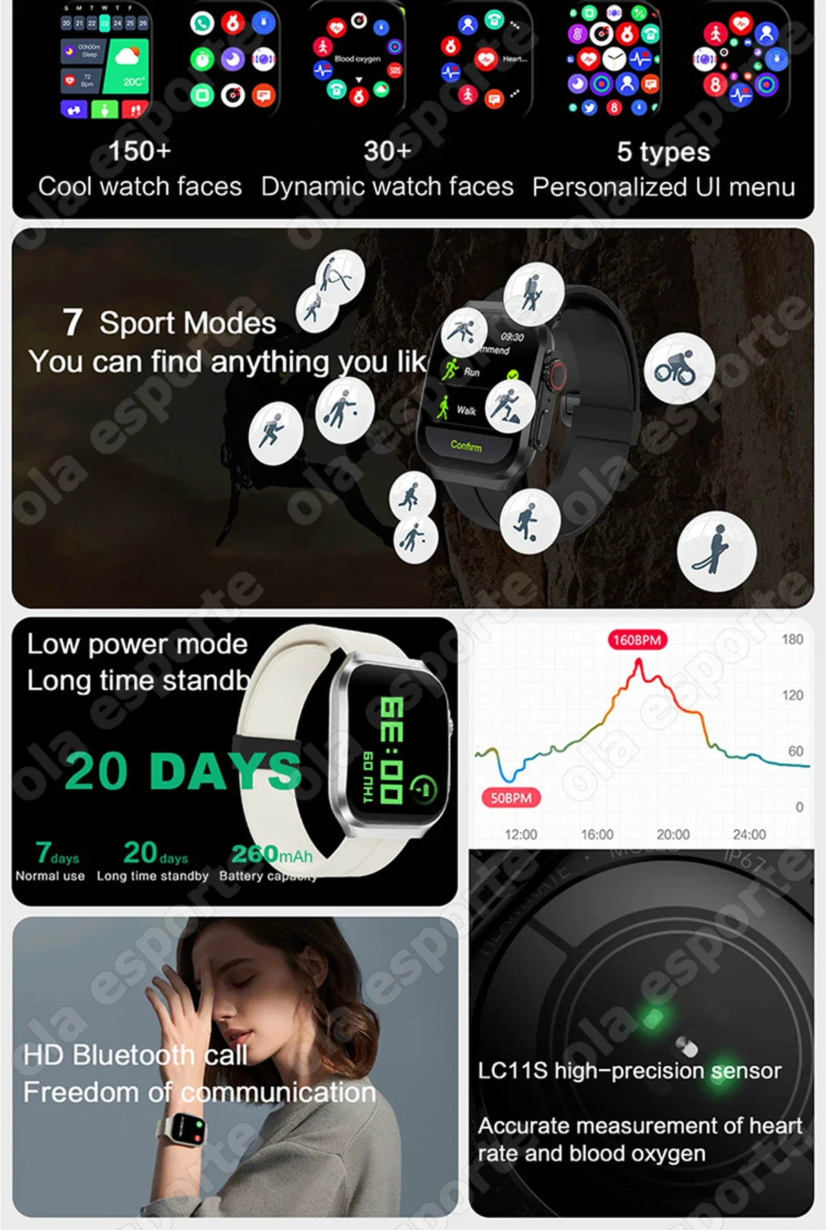 Упражнения: бег на открытом воздухе, ходьба на открытом воздухе, Ola Esporte, езда на велосипеде в помещении, бег в помещении, ходьба в помещении, бесплатные упражнения; кислород крови, мониторинг сна, информационное уведомление, переключение набора номера, подключение Bluetooth-гарнитуры TWS; подключение цепи динамика Bluetooth, системное меню, телефонная книга, настройка яркости, перезапуск, история вызовов, удаленная камера; калькулятор, голосовой помощник, Поддержка обновления мобильного приложения OTA.