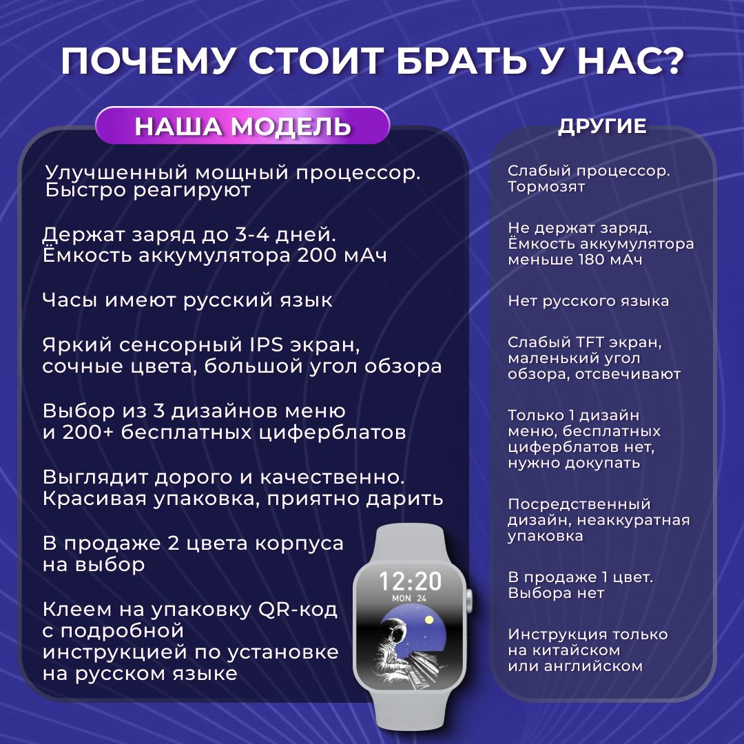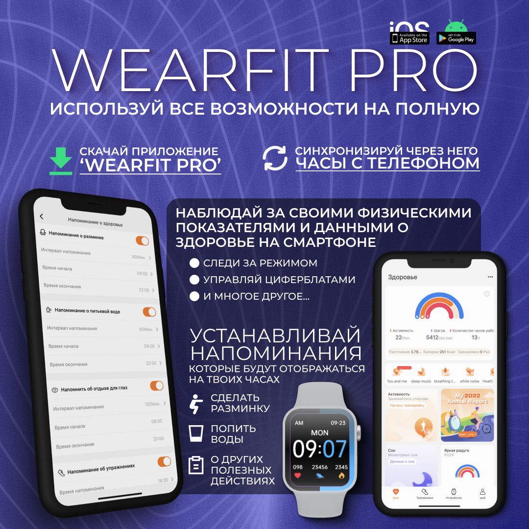 Часы имеют: множество функций, выбор циферблатов, производительный чип Bluetooth 5.2, отзывчивый сенсор, качественную синхронизацию со смартфонами на платформах Android и iOS совместно с приложением WearfitPro (которое вы можете скачать в App Store, Google Play, или просканировав QR-код на задней части упаковки)