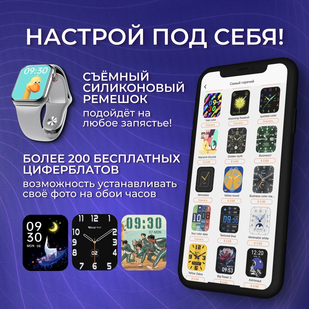 Дополнительно можно скачать множество бесплатных циферблатов на любой вкус. При этом ты всегда имеешь возможность устанавливать свои картинки на главные обои смарт вотч через функцию "Пользовательский интерфейс".