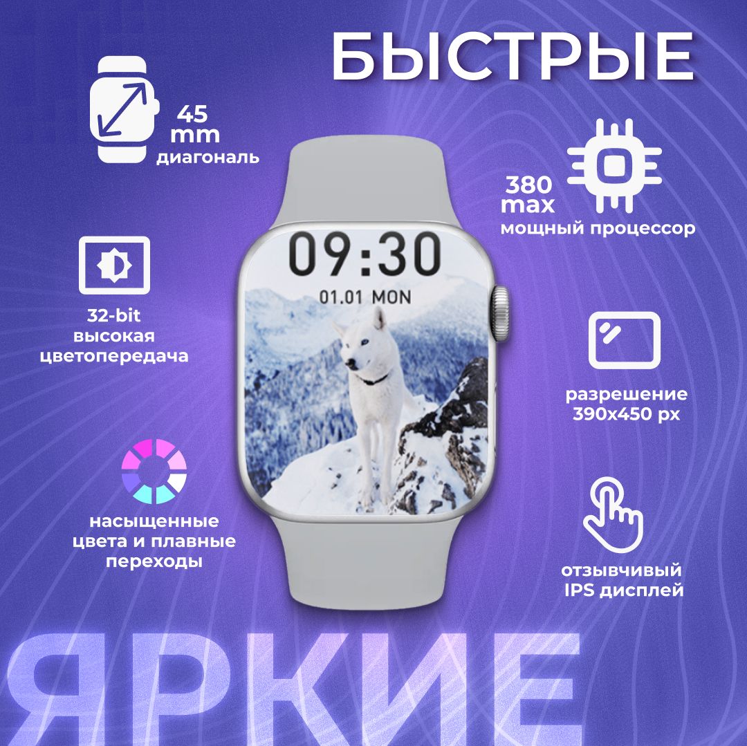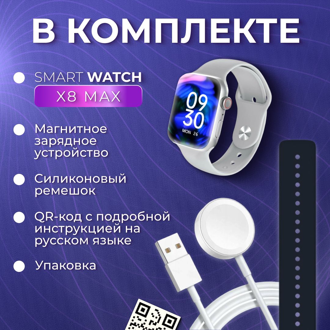 Описание: Часы Smart Watch X8 Max - Хит сезонаУмные часы премиальной серии Smart Watch X8 Max на русском языке - это одни из самых продвинутых и качественных смарт-часов с беспроводной зарядкой, круглым циферблатом и большим экраном 45 мм.