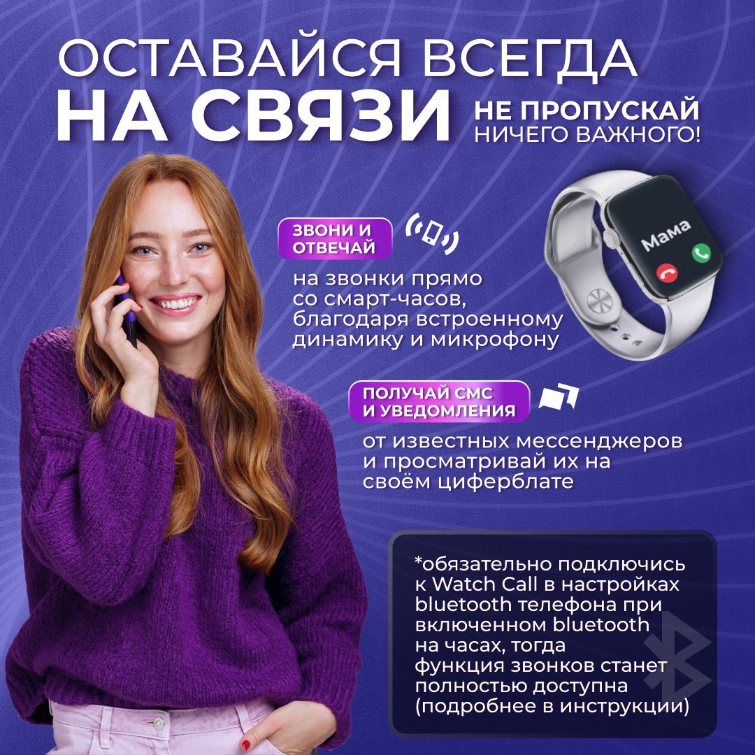 Не пропускай звонки и уведомления! Будь всегда на связи!Ты можешь звонить и отвечать на звонки прямо со смарт-часов, благодаря встроенному микрофону и динамику. Для этого синхронизируй часы с телефоном по Bluetooth и будь всегда на связи.